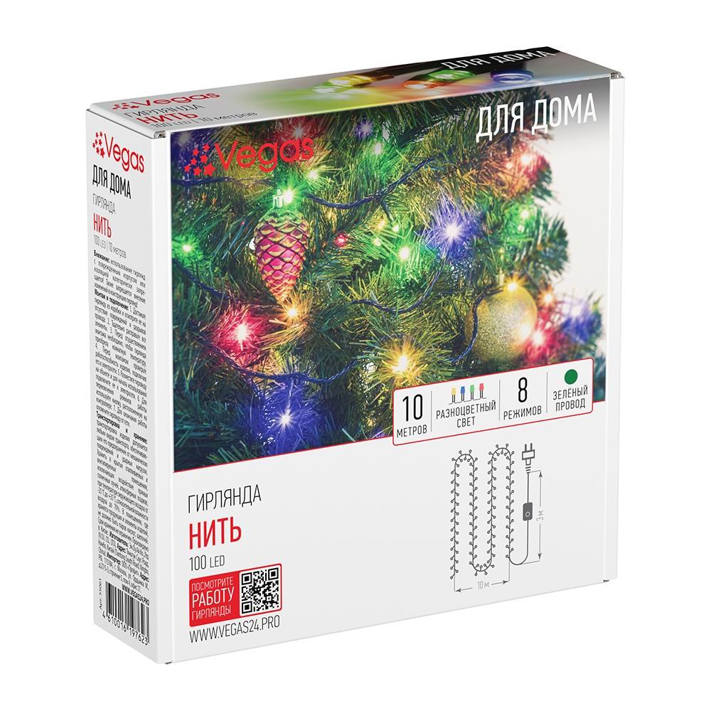 Электрогирлянда VEGAS Нить 100 разноцветных LED ламп, контроллер 8 режимов, зеленый провод, 10 м, 220 v /20
