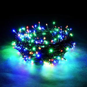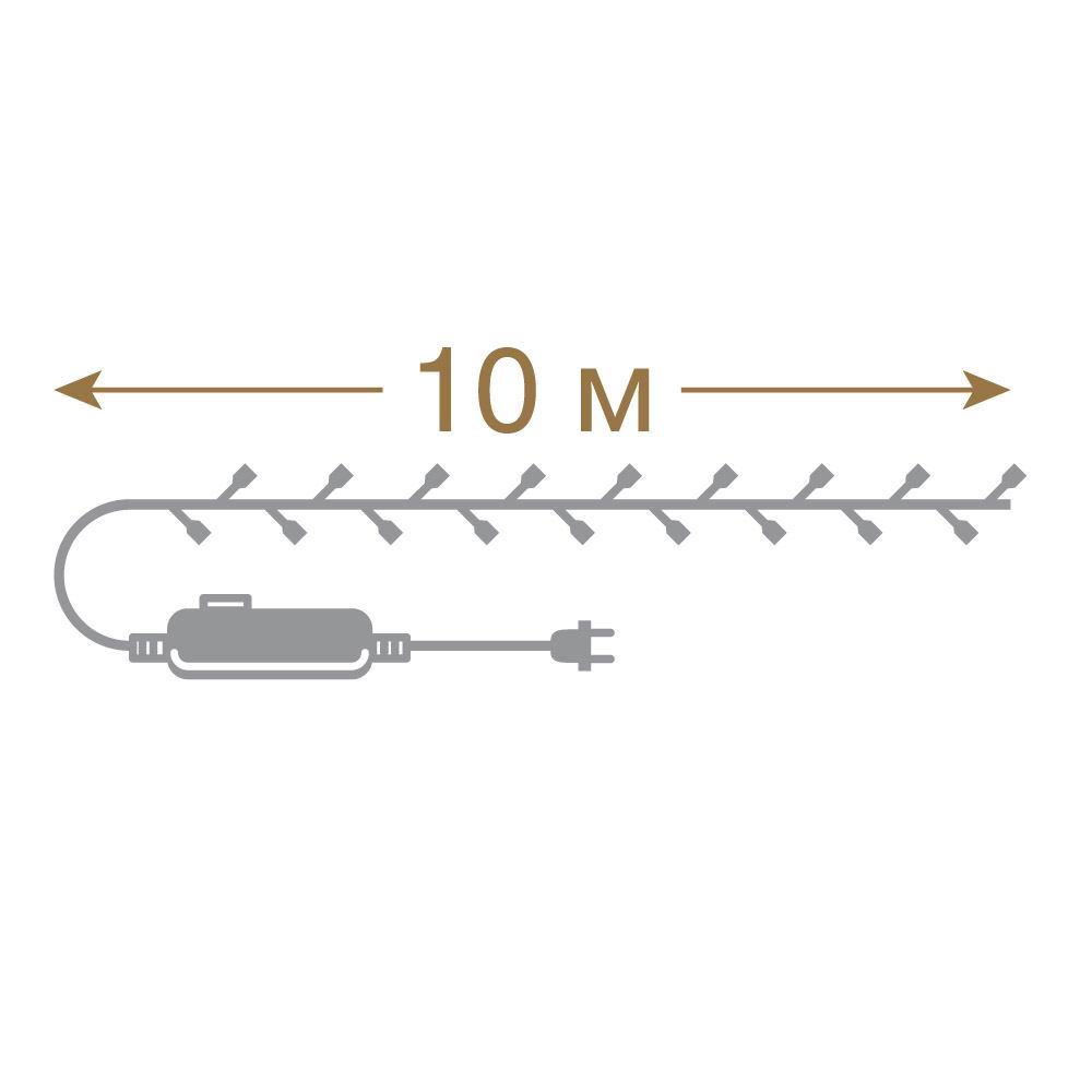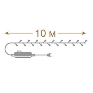 Длина гирлянды 10 м, длина провода 3 м, количество светодиодов 100. Цвет свечения разноцветный, цвет провода зеленый. Степень защиты IP 20. Мощность 6 W. Гирлянда имеет контроллер (8 режимов работы). Использовать при комнатной температуре. Срок службы 25 000 часов.