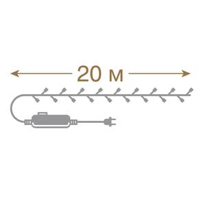 Длина гирлянды 20 м, длина провода 3 м, количество светодиодов 200. Цвет свечения разноцветный, цвет провода зеленый. Степень защиты IP 20. Мощность 4 W. Гирлянда имеет контроллер (8 режимов работы). Использовать при комнатной температуре. Срок службы 25 000 часов.