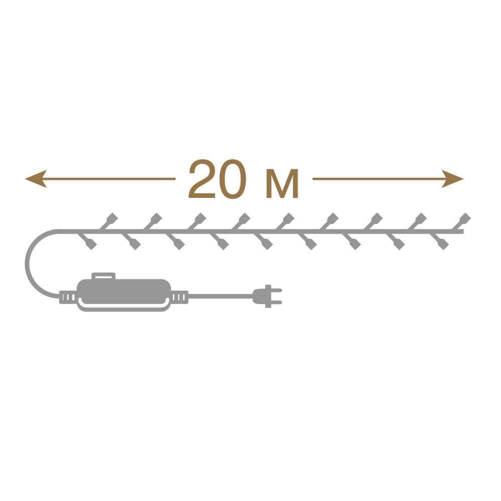 Длина гирлянды 20 м, длина провода 3 м, количество светодиодов 200. Цвет свечения холодный, цвет провода зеленый. Степень защиты IP 20. Мощность 4 W. Гирлянда имеет контроллер (8 режимов работы). Использовать при комнатной температуре. Срок службы 25 000 часов.
