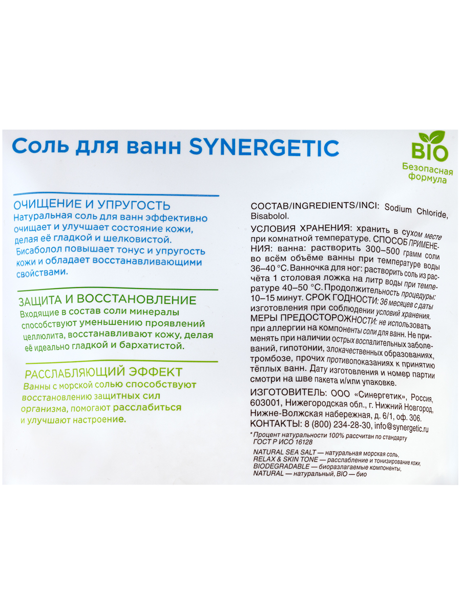 ОЧИЩЕНИЕ И УПРУГОСТЬНатуральная соль для ванн эффективно очищает и улучшает состояние кожи, делая ее гладкой и шелковистой. Бисаболол повышает тонус и упругость кожи и обладает восстанавливающими свойствами.