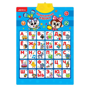Двусторонний говорящий плакат станет незаменимым помощником для родителей. Азбука и первые знания, герои известных мультиков, 16 песенок и мелодий, 5 веселых игр, пианино – всё это поможет провести время и весело, и с пользой.Дети смогут выучить буквы, цифры, формы и цвета, познакомиться с животными и музыкальными инструментами. Для проверки знаний есть умные игры: «Угадай букву», «Умняшка», «Музыкальная угадайка», «Веселые знания», «Чей голос». Любимые мультяшки сделают занятия еще интереснее – они и песенки споют, и сыграют мелодии на разных музыкальных инструментах.