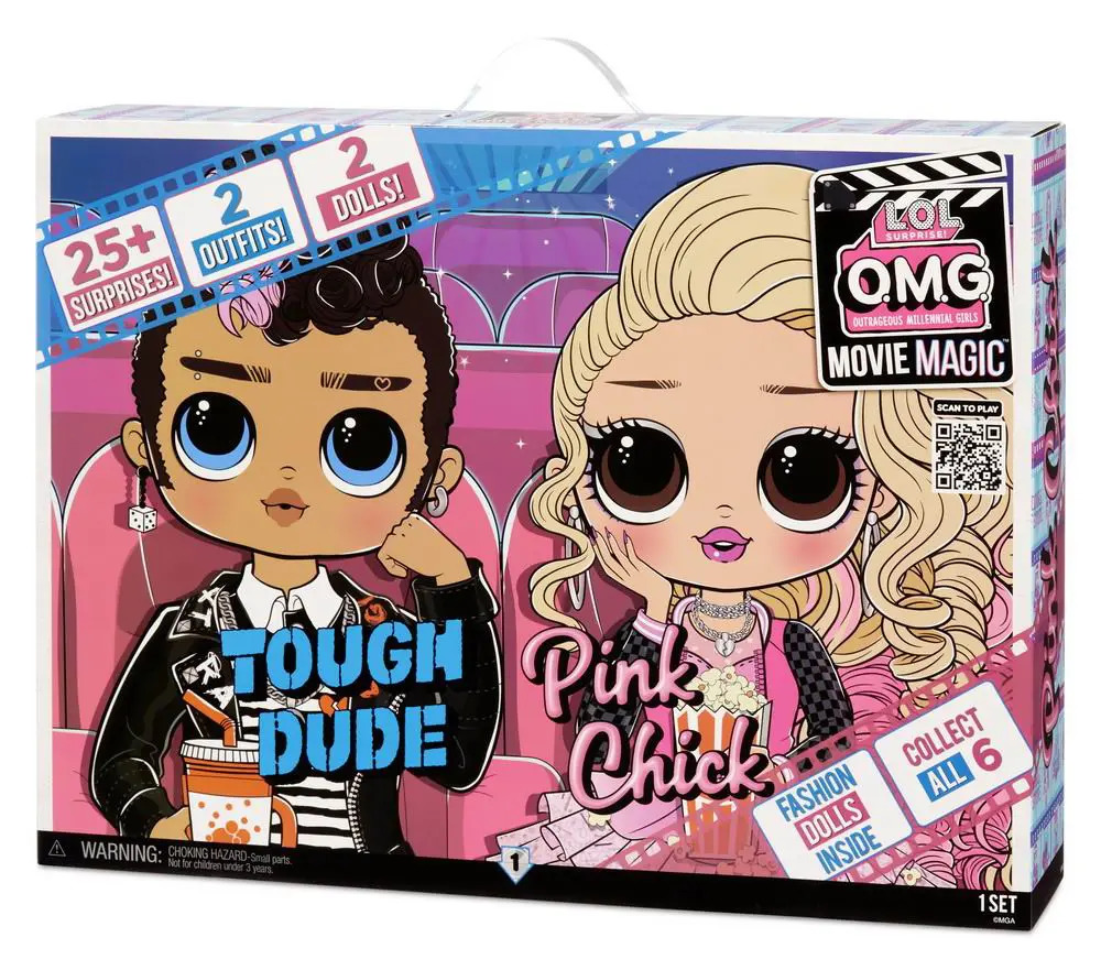 Набор с двумя большими куклами LOL Surprise OMG в стиле Movie Magic Fashion Dolls – девочка Pink Chick и мальчик Tough Dude. Шикарная детализация, съемная одежда и 25 сюрпризов для каждой куклы. Теперь снимать собственное кино еще интереснее!Внутри 4 модных наряда, обувь, модные аксессуары, 3D-очки, сцены из фильмов, сценарии фильмов, шляпные коробки, расчески, сумки для одежды, наклейки, вешалки, подставки для кукол.