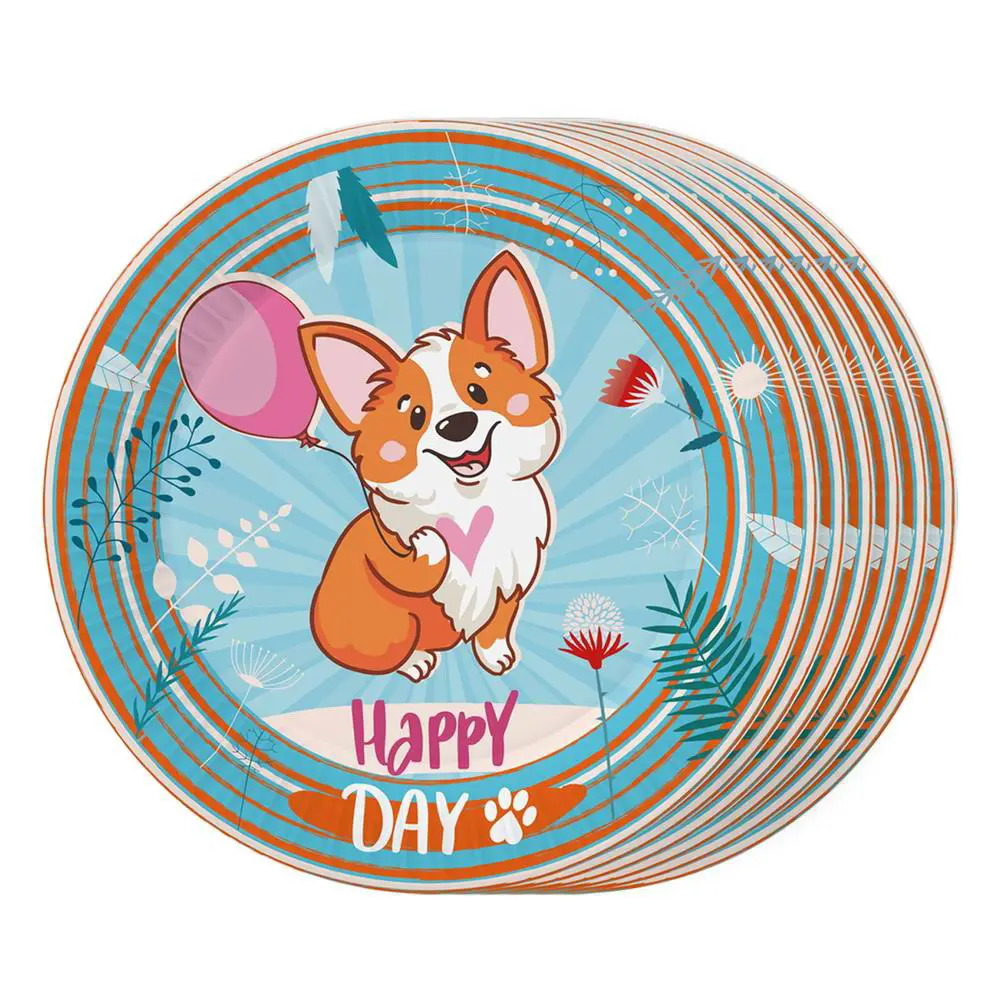 Набор бумажных тарелок «Корги» - стильный элемент для украшения стола на пикнике, вечеринке или в День Рождения. На каждой тарелке изображены забавные собачки корги.Набор для пикника состоит из 6 бумажных тарелок диаметром 180 мм, упакованных в пластиковый пакет с еврохолдером. Тарелки изготовлены из плотного мелованного картона, который не промокнет во время пикника.