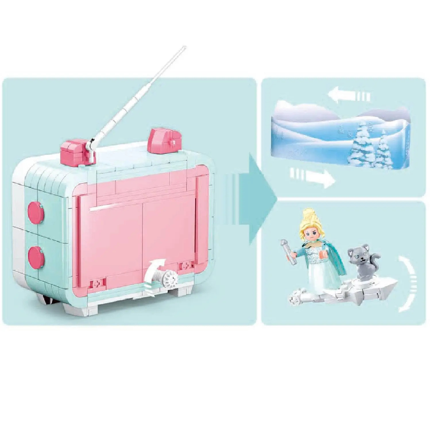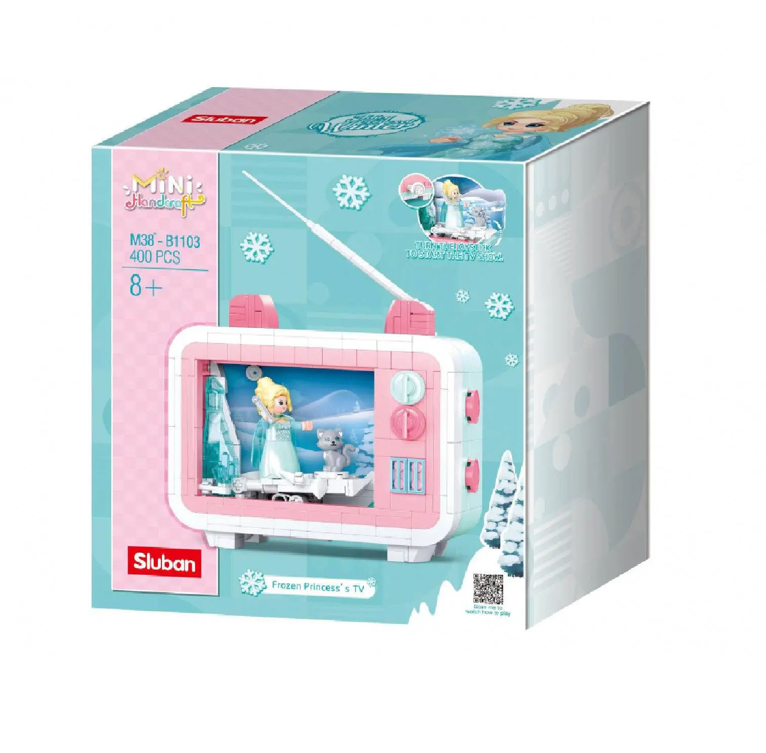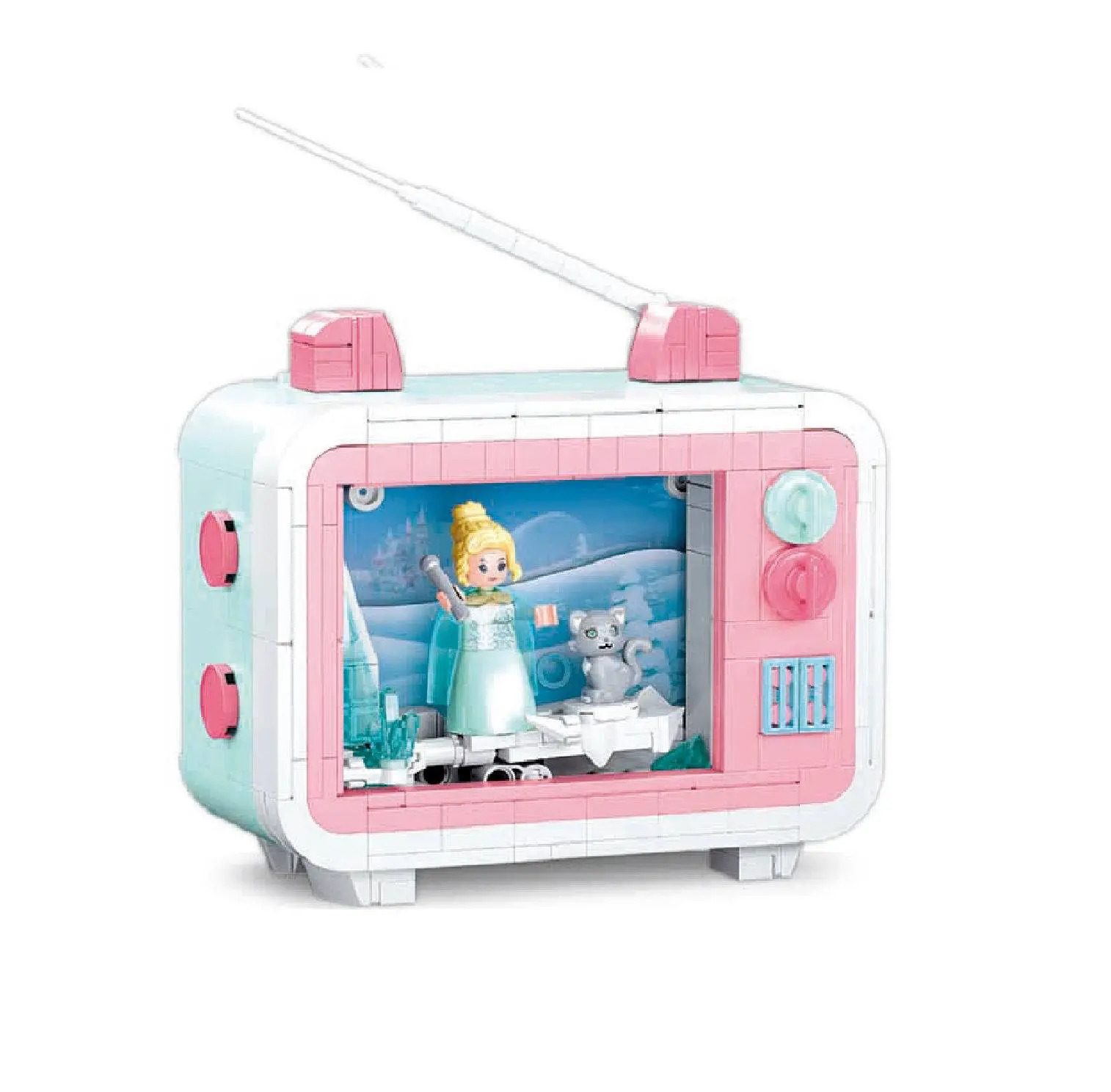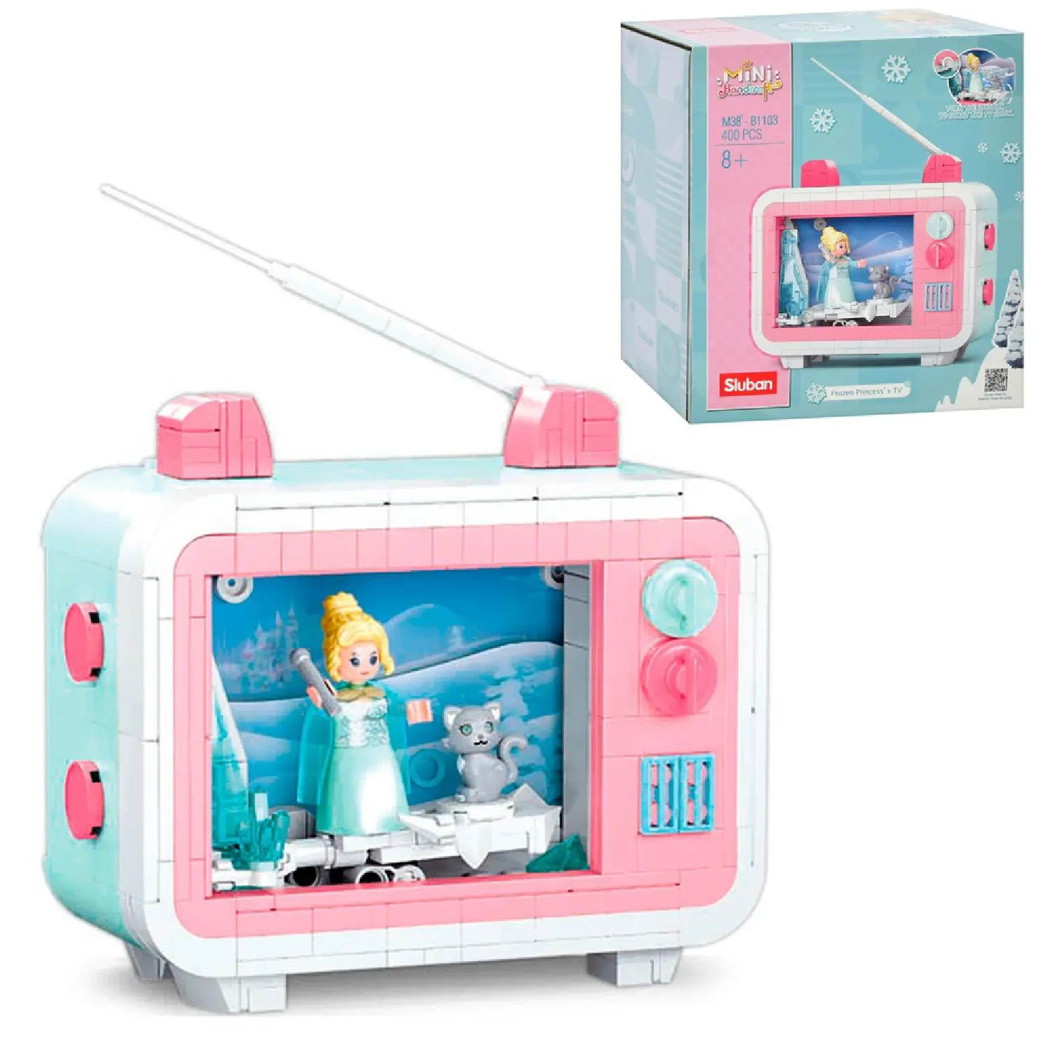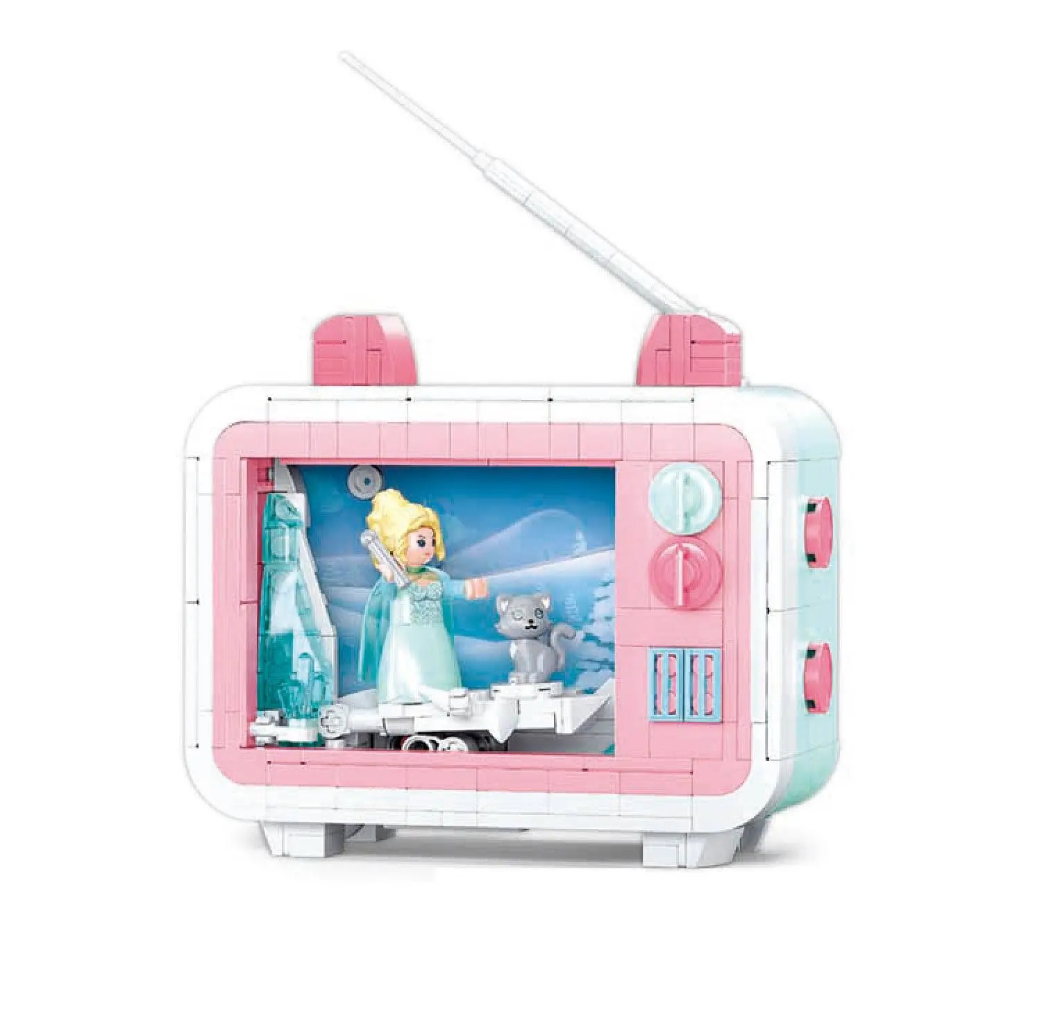 Конструктор Sluban из серии «MiNi Handcraft» позволит ребенку собственными руками собрать уникальную необычную модель телевизора, внутри которого происходит действие фильма с участием снежной королевы и ее серого котика. Пейзаж за ее спиной может меняться, для этого достаточно вращать ручку, размещенную с задней стороны телевизора. Телевизор выполнен в нижних пастельных тонах, стоит на специальных ножках, оснащен кнопками, телевизионная антенна завершает его образ. Простое и надежное соединение деталей разных размеров и форм между собой обеспечат специальные крепления. Во время игры ребенок сможет задействовать свою фантазию и придумать интересные сценарии. В процессе сборки и игры с готовой моделью юный конструктор будет развивать мелкую моторику рук, пространственное мышление, внимательность и усидчивость.Комплектность: 400 деталей, инструкция по сборке.