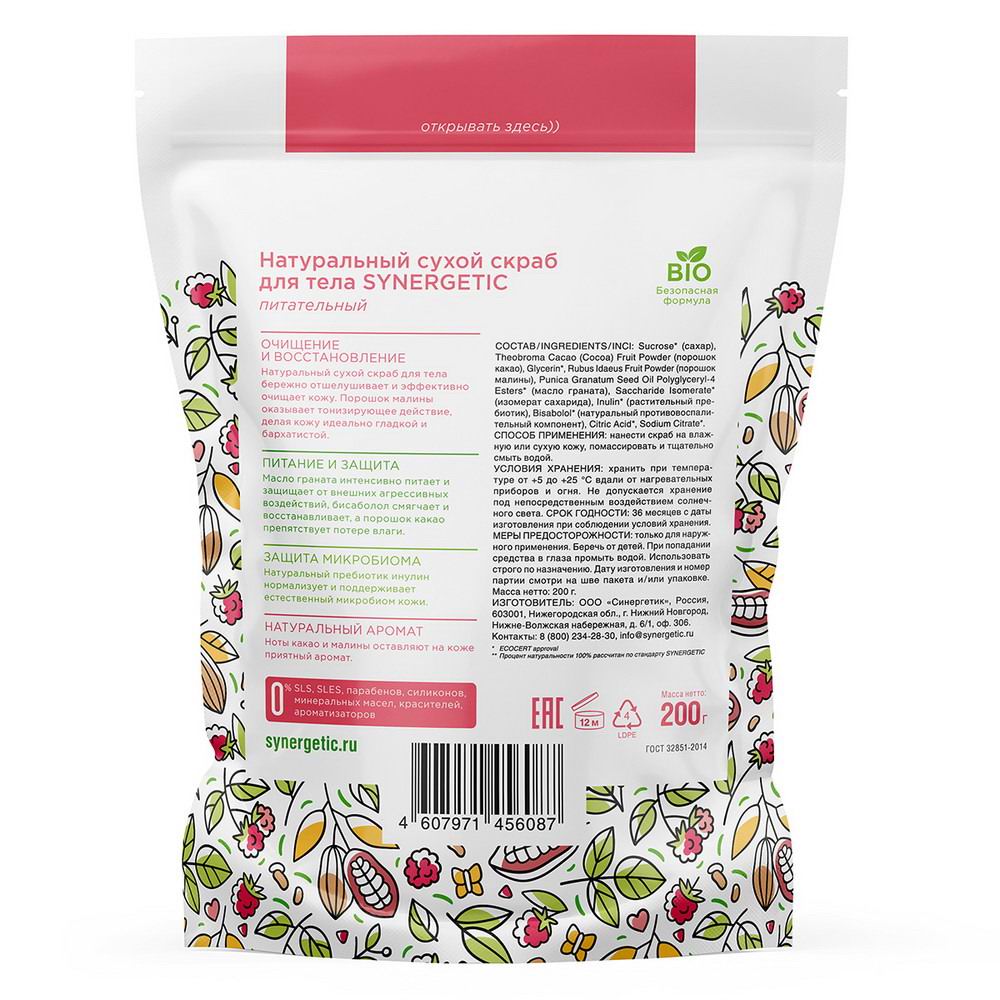 Натуральный сухой скраб для тела SYNERGETIC питательный бережно отшелушивает, очищает, питает и тонизирует кожу, оказывая разглаживающий эффект. Натуральный пребиотик инулин нормализует и поддерживает естественный микробиом, а противовоспалительный компонент бисаболол успокаивает, снимает раздражения и выравнивает поверхность кожи. Масло граната интенсивно питает и восстанавливает кожу, предотвращая появление морщин и раннее старение. Порошок малины сужает поры и подтягивает, обладает отбеливающим действием. Какао эффективно борется с целлюлитом, против отечности и потери упругости кожи.
