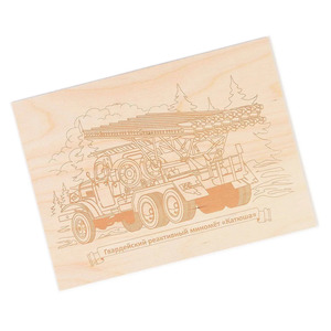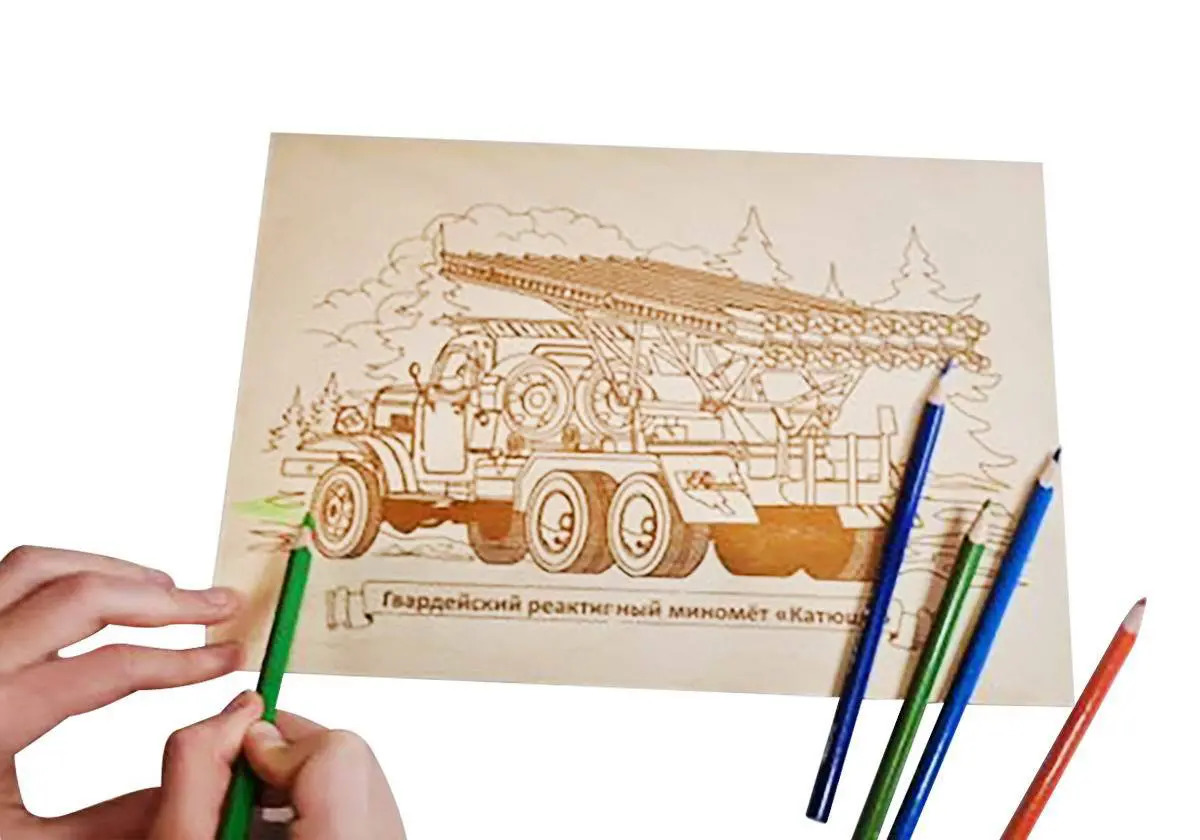 Доска для выжигания «Гвардейский реактивный миномёт: Катюша». Изображает реальную советскую боевую машину «Катюша». Состав: доска с нанесённым рисунком – 1 шт. (28,5 х 21 см). Материал: берёзовая фанера. Тренирует мелкую моторику, усидчивость, внимательность, кропотливость, прививает интерес к ручному искусству.
