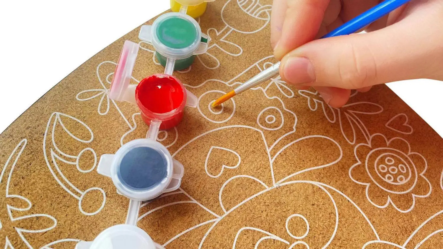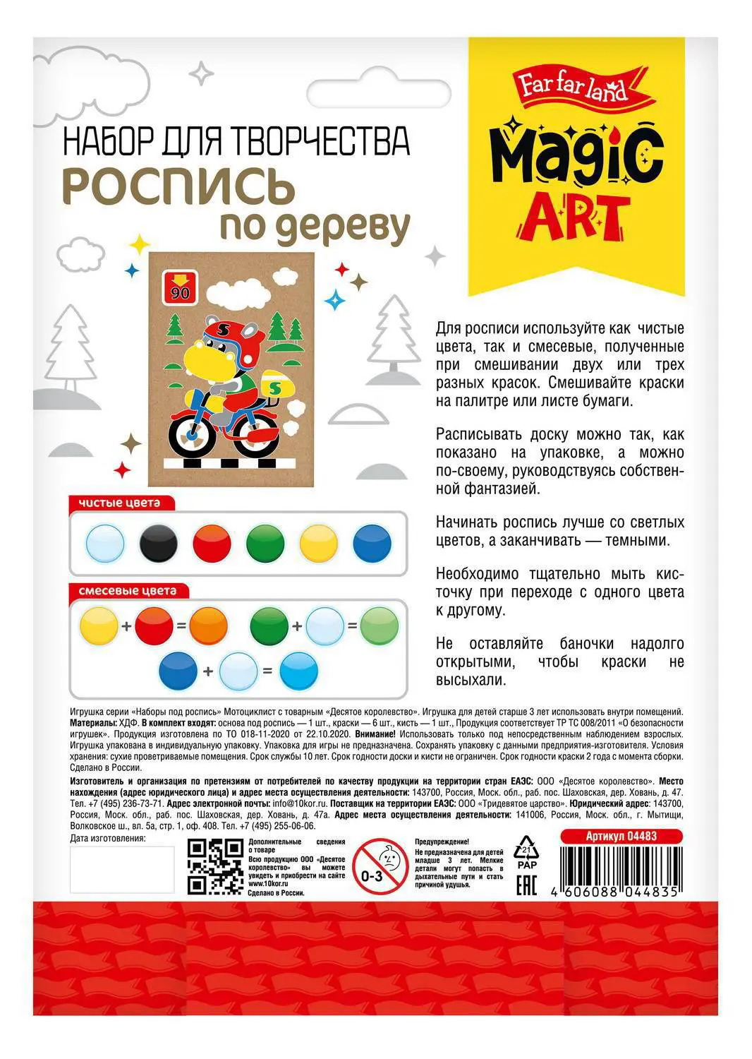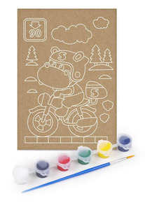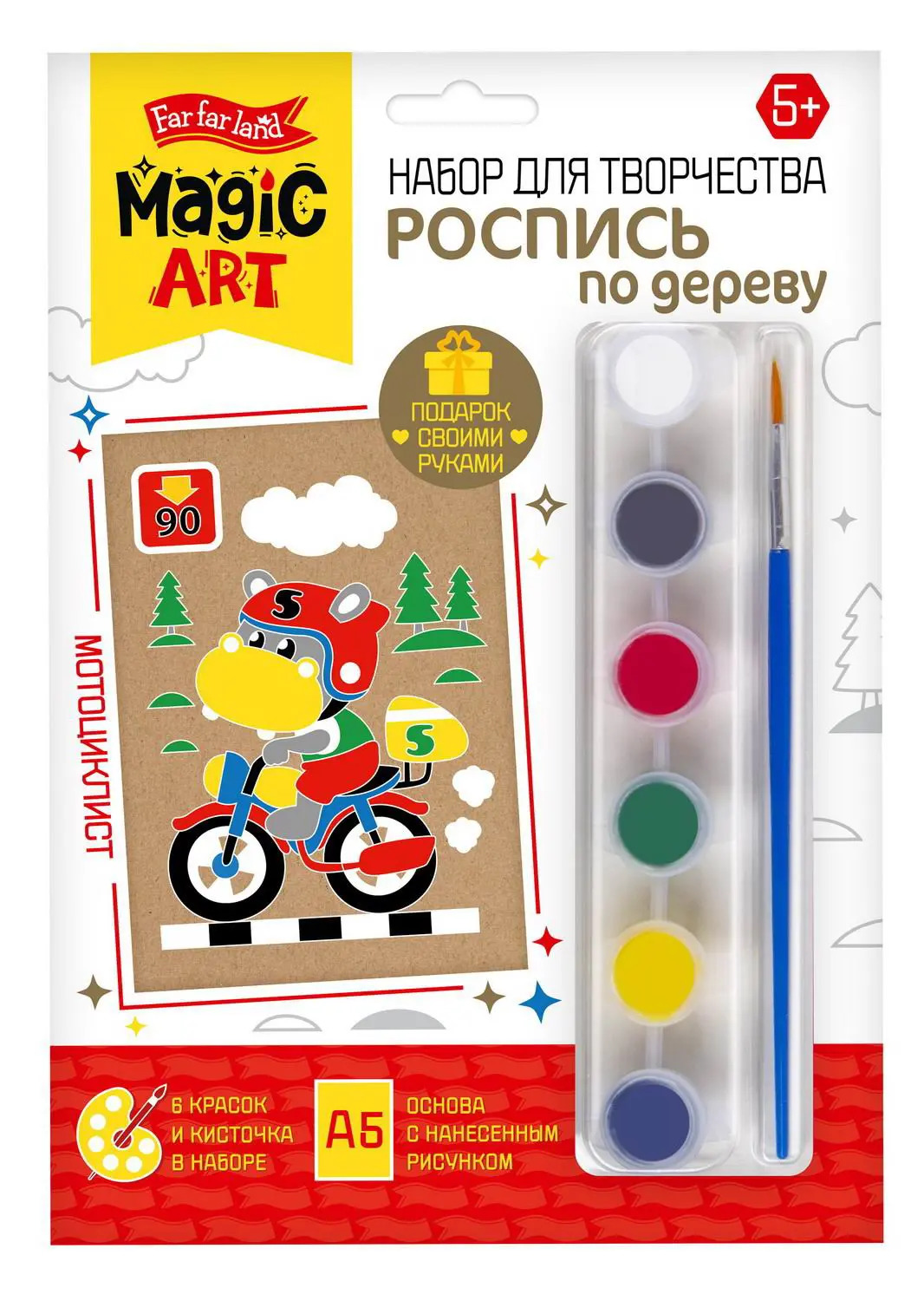 Роспись по дереву «Мотоциклист» Состав набора:основа под роспись (доска из фанеры) – 1 шт. (22,5 х 13 см) краски (белого, чёрного, желтого, красного, синего, зеленого цветов) -– 6 шт. кисточка – 1 шт. Набор предназначен для детей от 5 лет.
