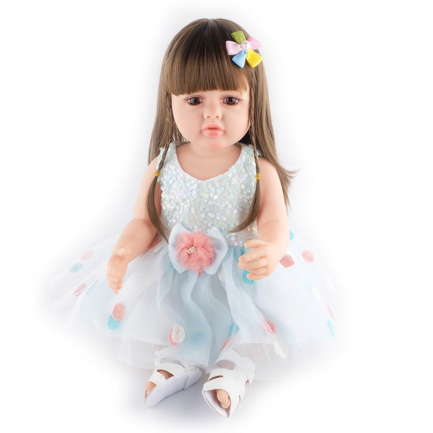 Восхитительная, реалистичная кукла от бренда Junfa - словно живая, она сразу приковывает к себе взгляд и обязательно завоюет любовь девочки. Игрушка напоминает миловидную, маленькую девочку с большими лучистыми глазами. У куклы длинные каштановые волосы, две пряди волос спереди заплетены в тонкие косички, сверху прическа украшена разноцветной заколкой в форме цветка. Кукла одета в роскошное, нарядное платье. Нежно-голубая, воздушная, многослойная юбка с цветочным бантом по центру пояса дополнительно украшена разноцветными шариками-клубочками, вышитыми на ткани. Светлый верх платья расшит переливающимися, перламутровыми пайетками. На ножках куклы обуты белые сандалии. Девочкам понравится прижимать куклу к себе, разглядывать ее реалистичное личико, причесывать ее волосы, а также придумывать для нее роли в различных игровых сюжетах.Кукла изготовлена из эластичного, достаточно мягкого и приятного на ощупь полимерного материалы. Ее руки и ноги легко сгибаются, при этом их легко вернуть в первоначальное положение. В процессе игры девочка сможет придавать кукле различные реалистичные позы.