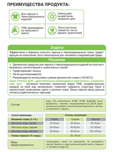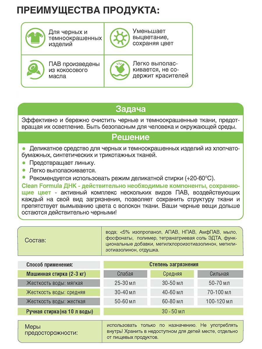Деликатное средство для черных и темноокрашенных изделий из хлопчатобумажных, синтетических и трикотажных тканей. Предотвращает линьку. Легко выполаскивается. Рекомендуется использовать режим деликатной стирки (+20-60°С).Clean Formula ДНК - действительно необходимые компоненты, сохраняющие цвет - активный комплекс нескольких видов ПАВ, воздействующих каждый на свой вид загрязнения, позволяет сохранить структуру ткани и препятствует вымыванию цвета с волокон ткани. Ваши черные вещи дольше остаются действительно черными!