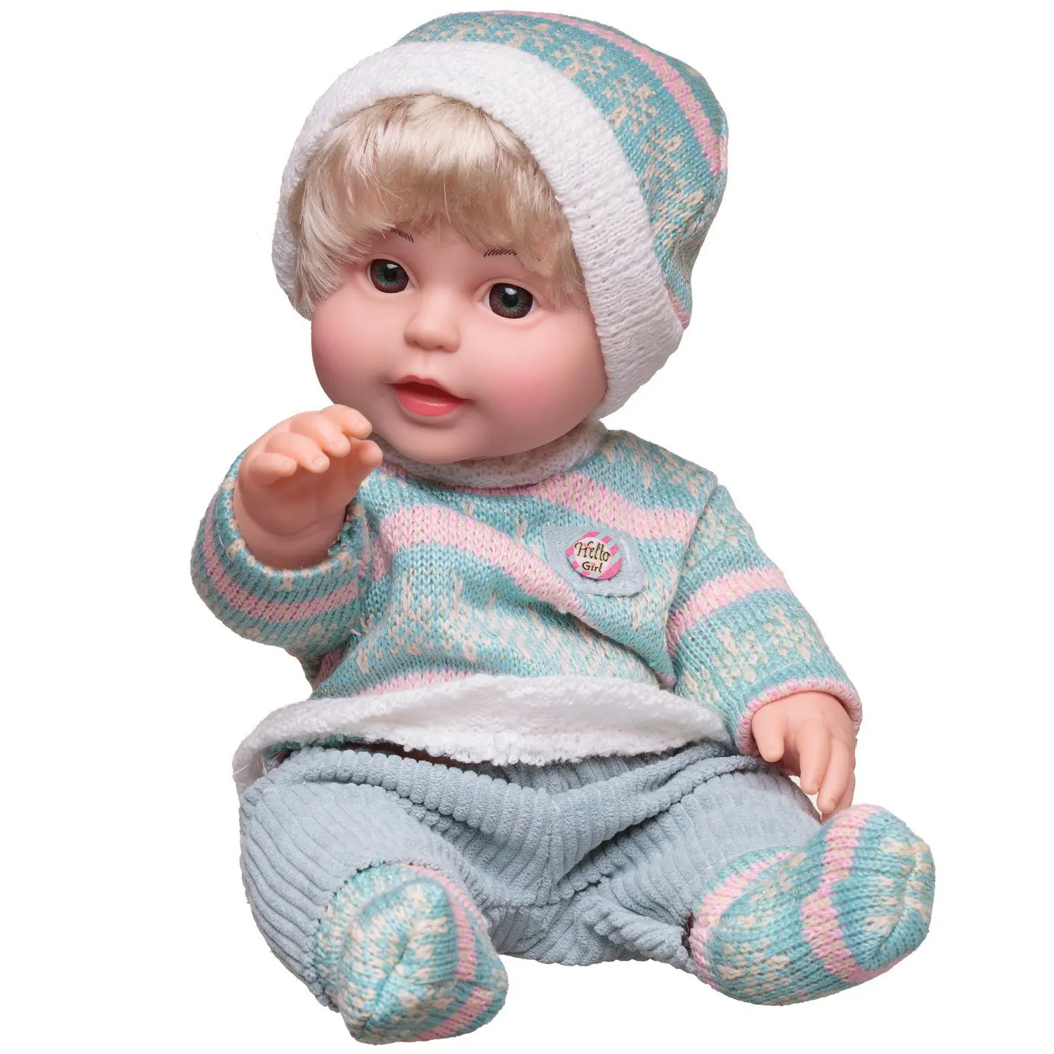 Пупс Junfa 34 см в коричневых толстовке и шапочке, бирюзовых клетчатых брюках