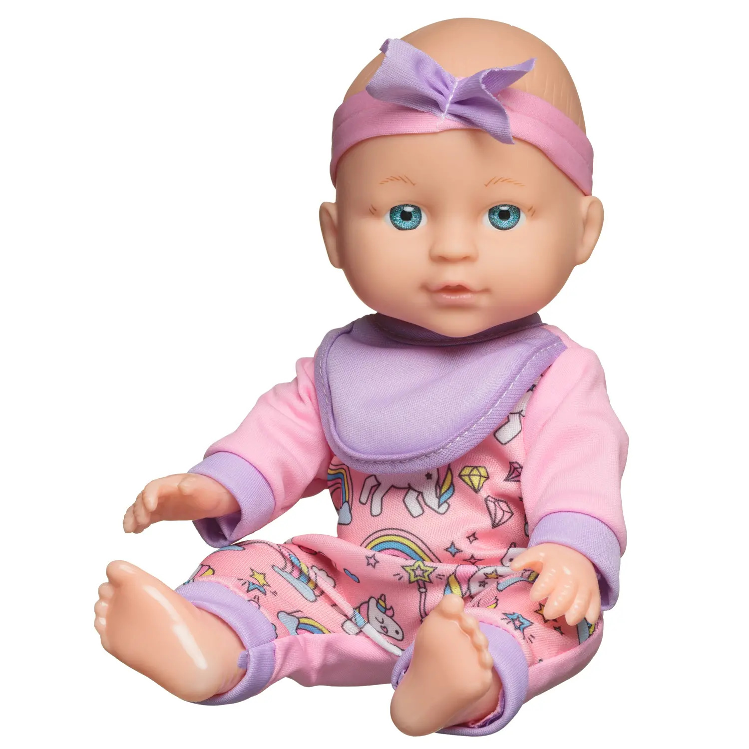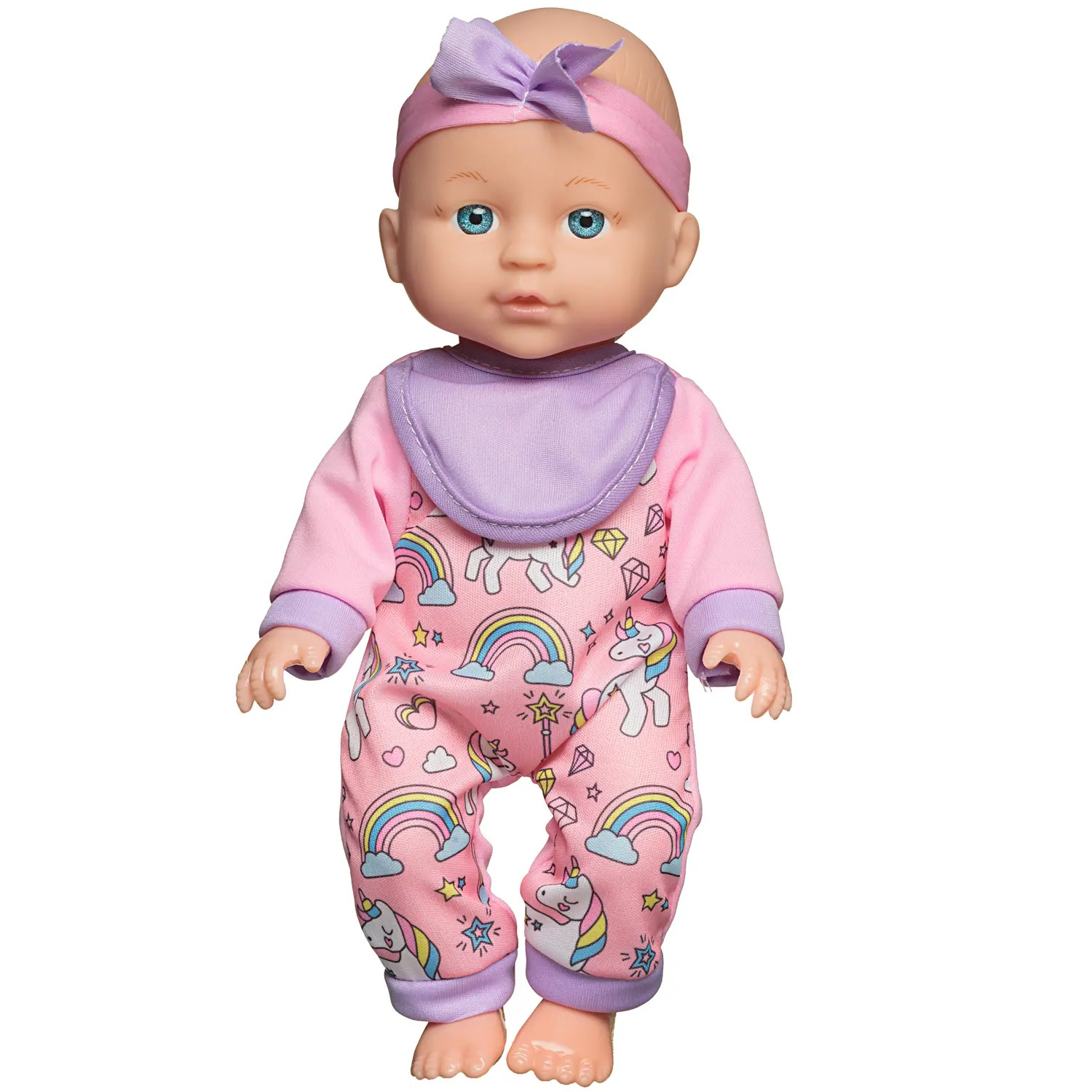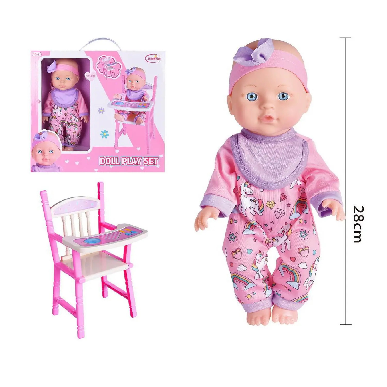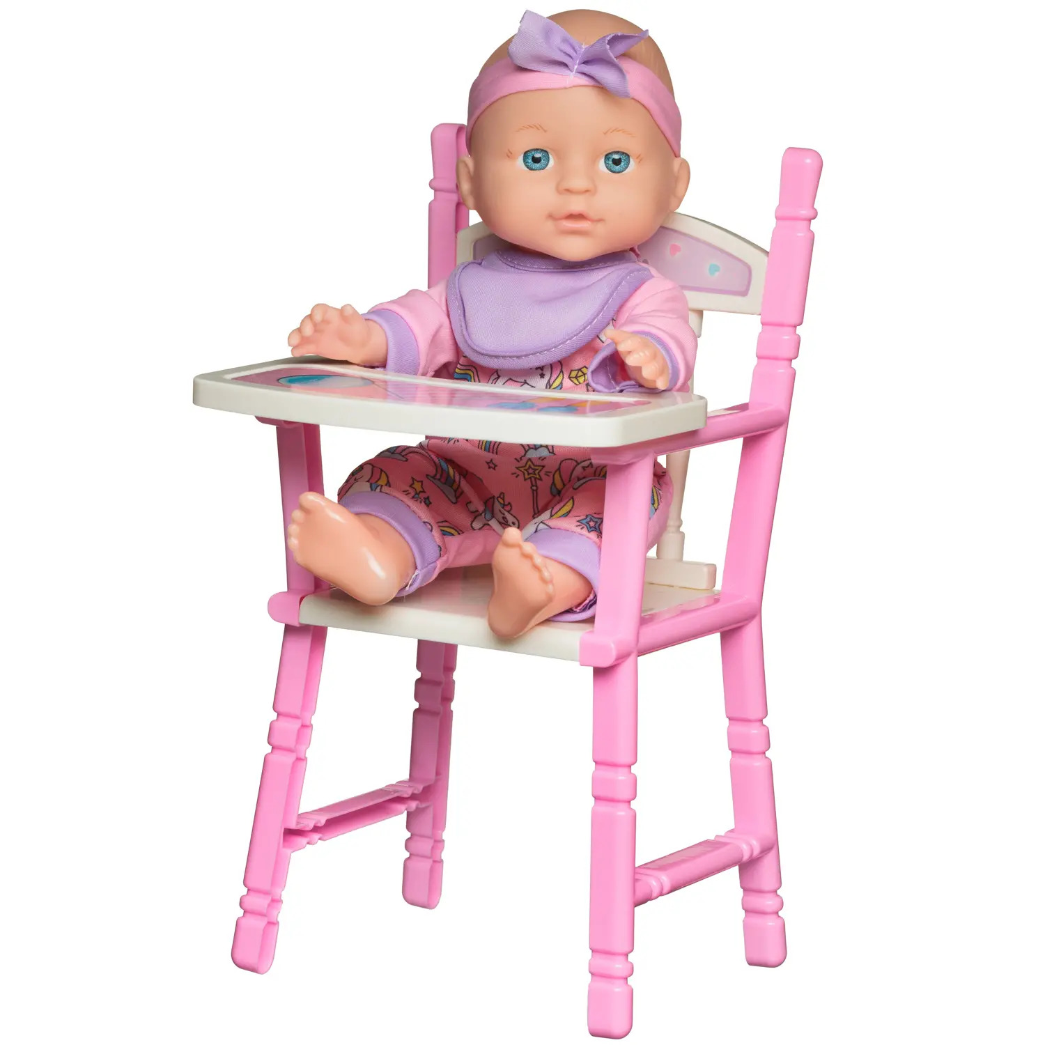 Игровой набор Junfa Пупс 28 см в розовом комбинезоне с изображением единорогов и стульчик для кормления