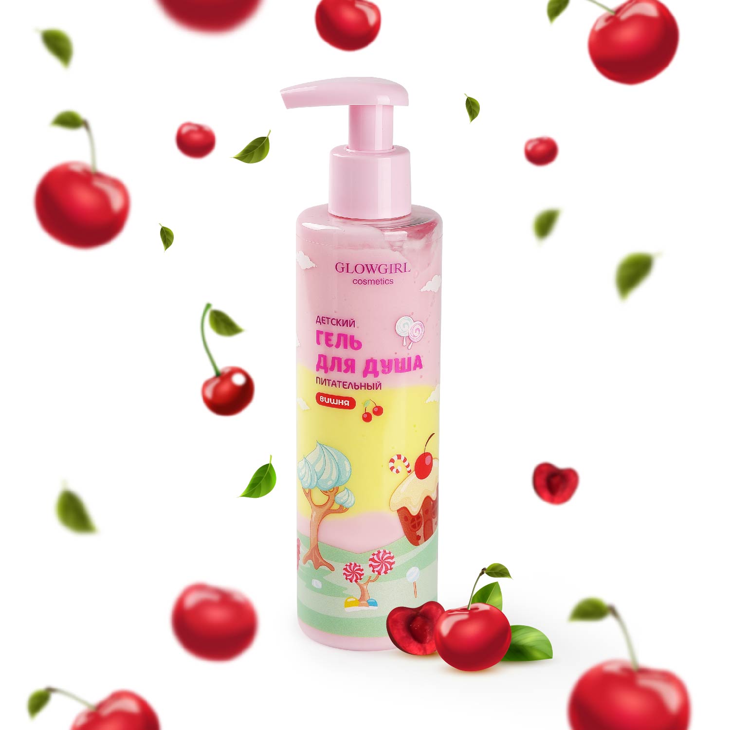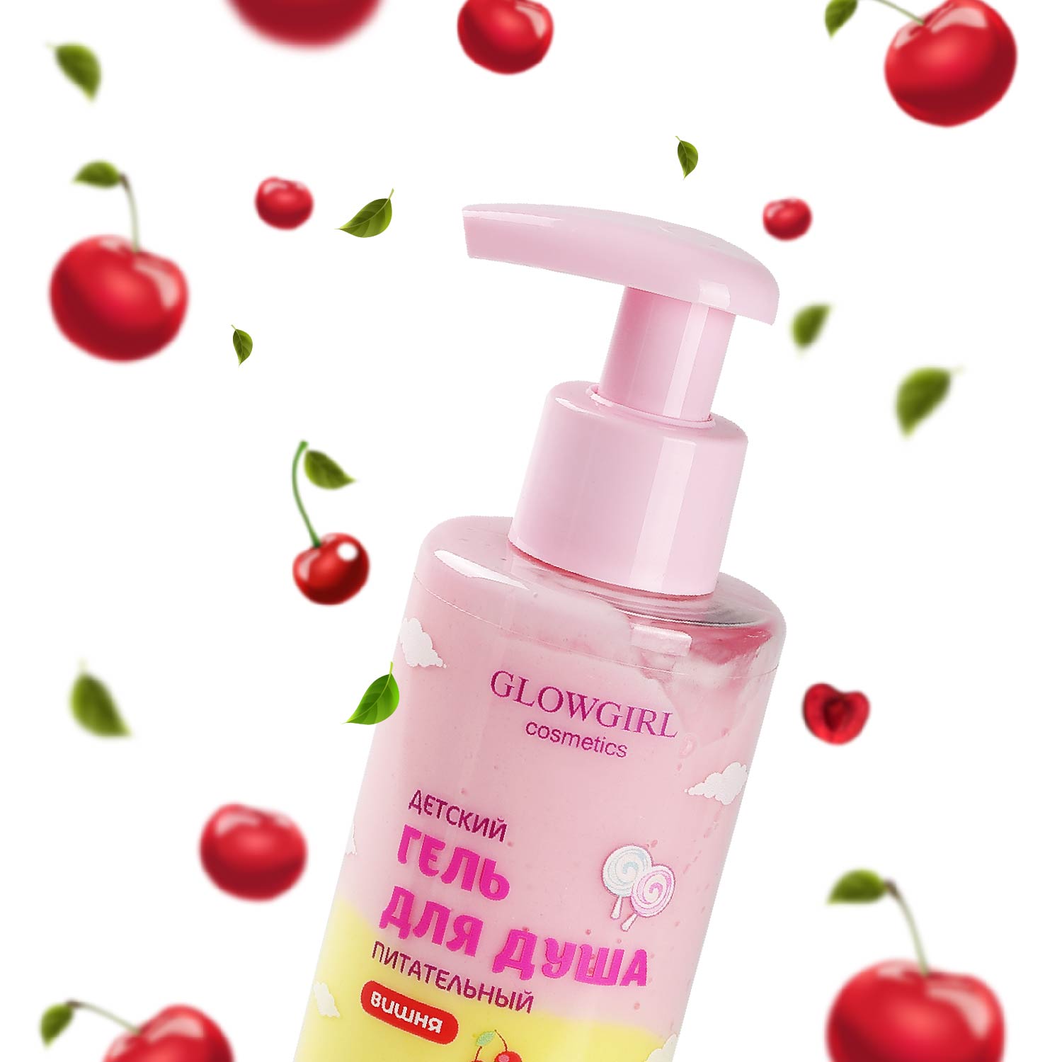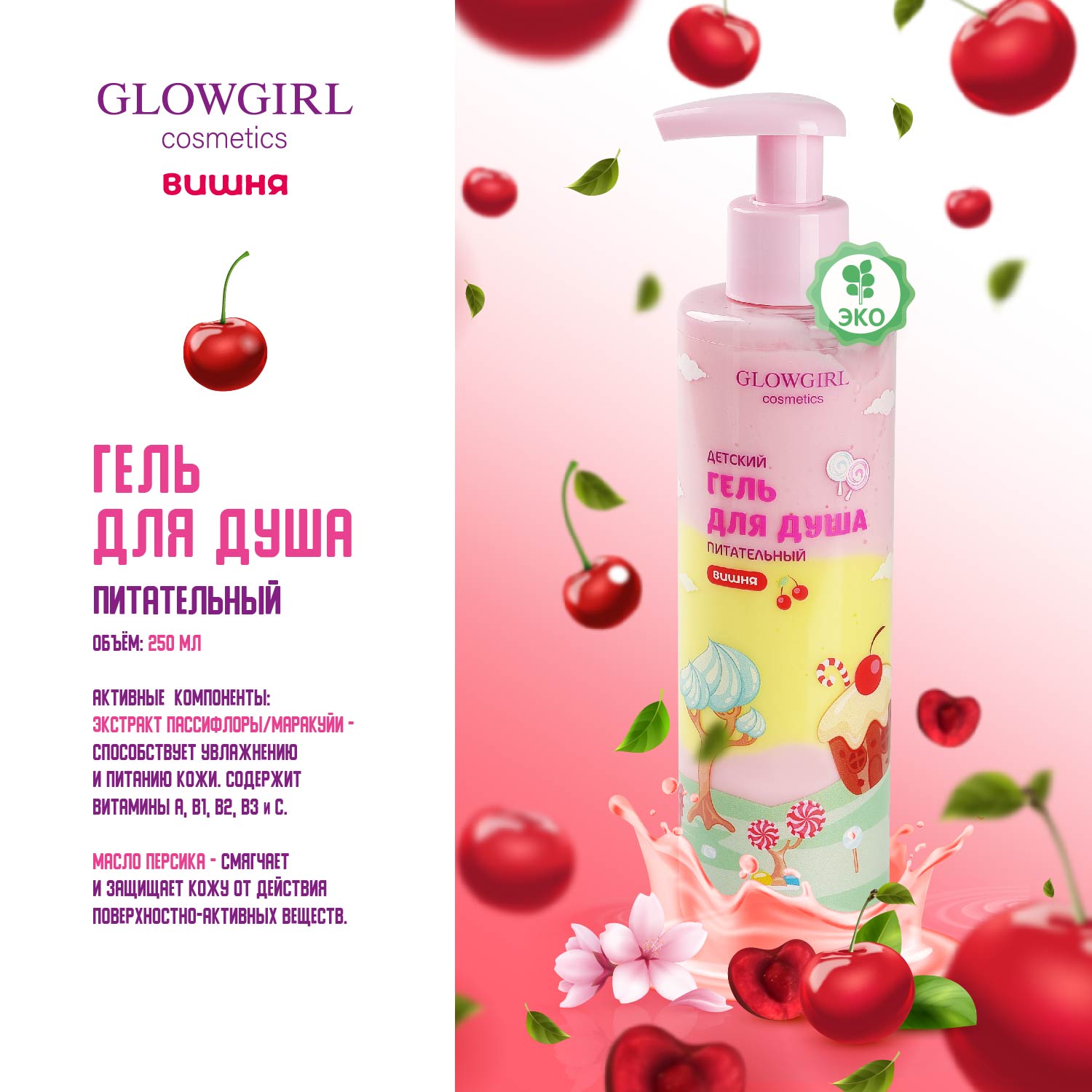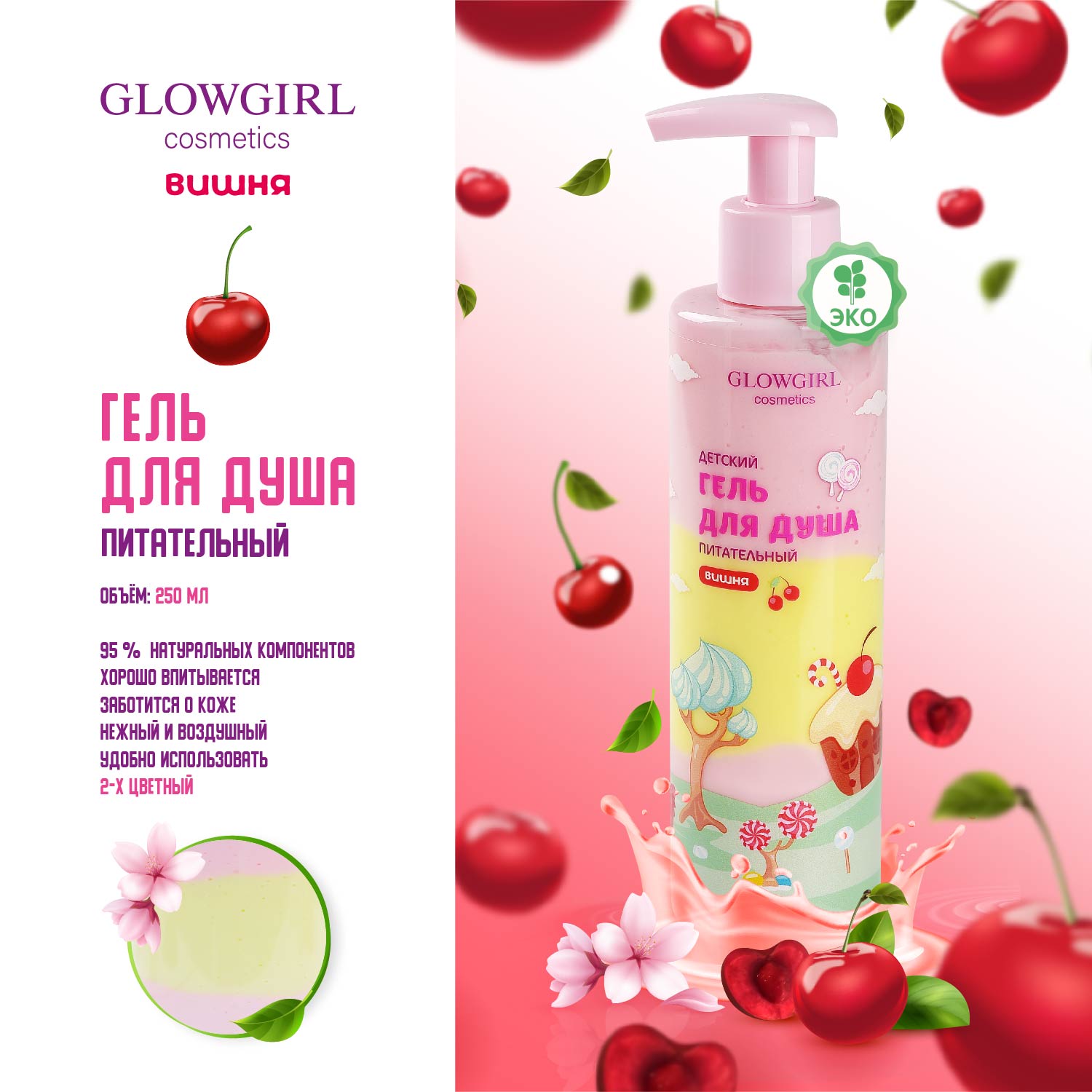 GLG1005 Glowgirl. Гель для душа питательный двухцветный детский Вишня, 250мл. ЭКО продукт.