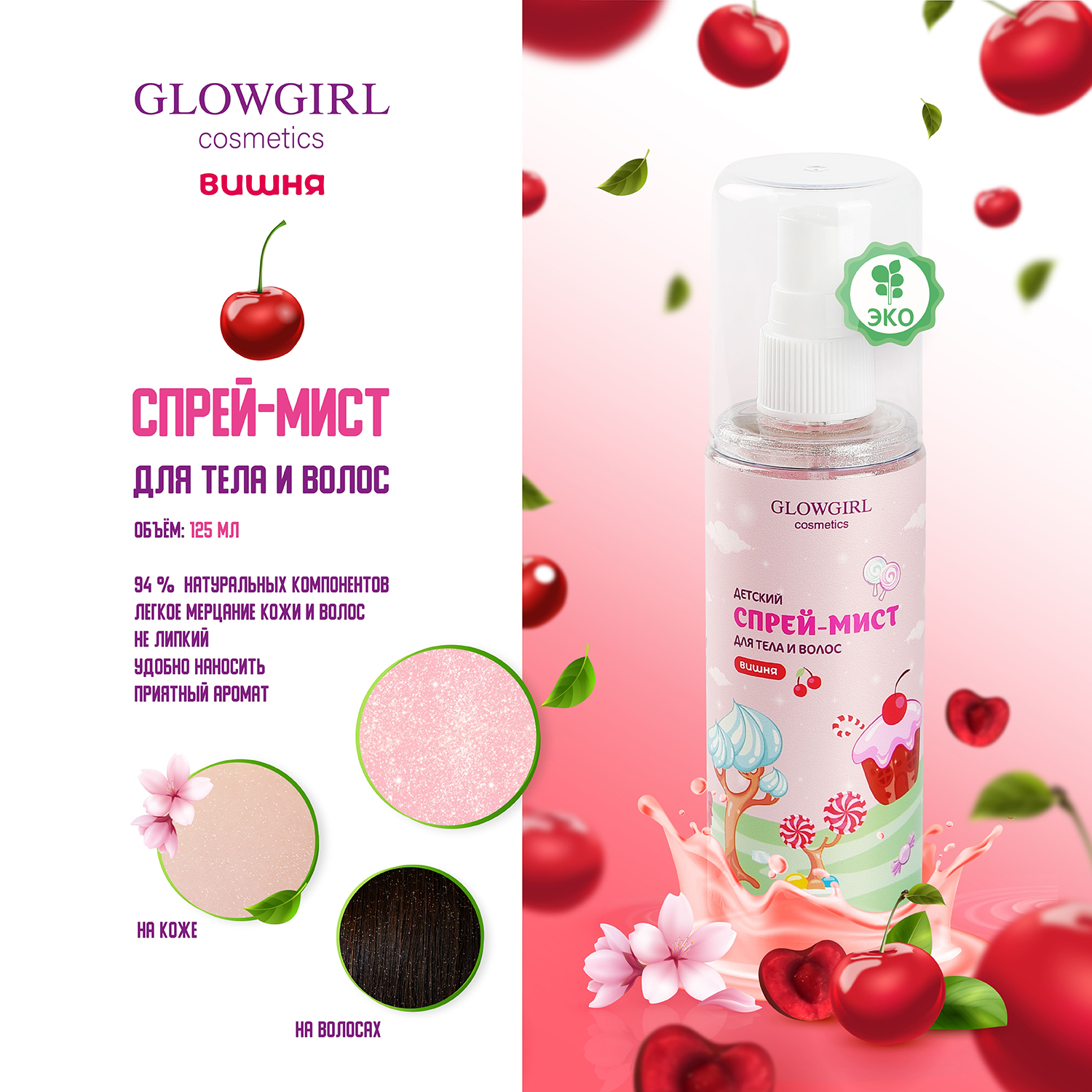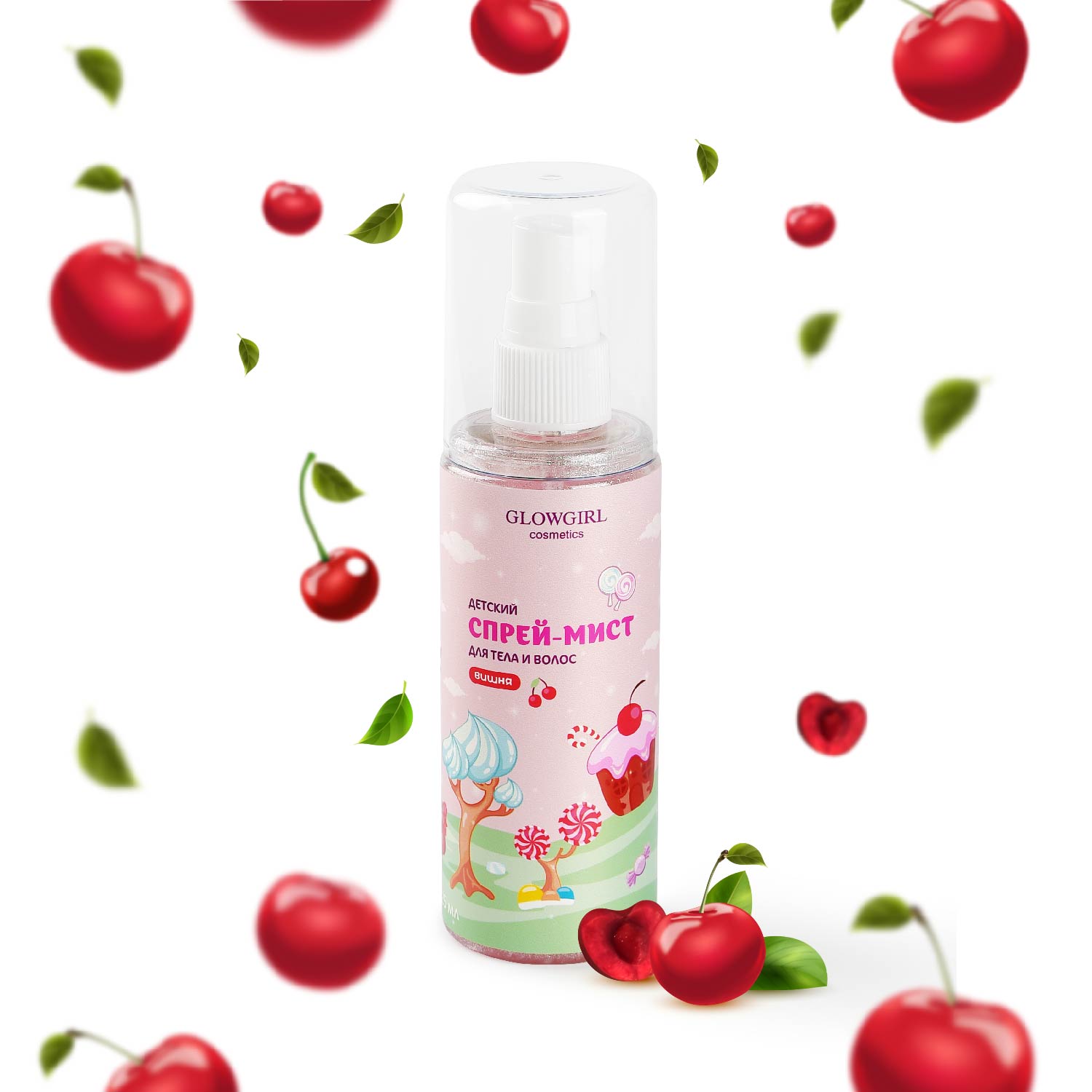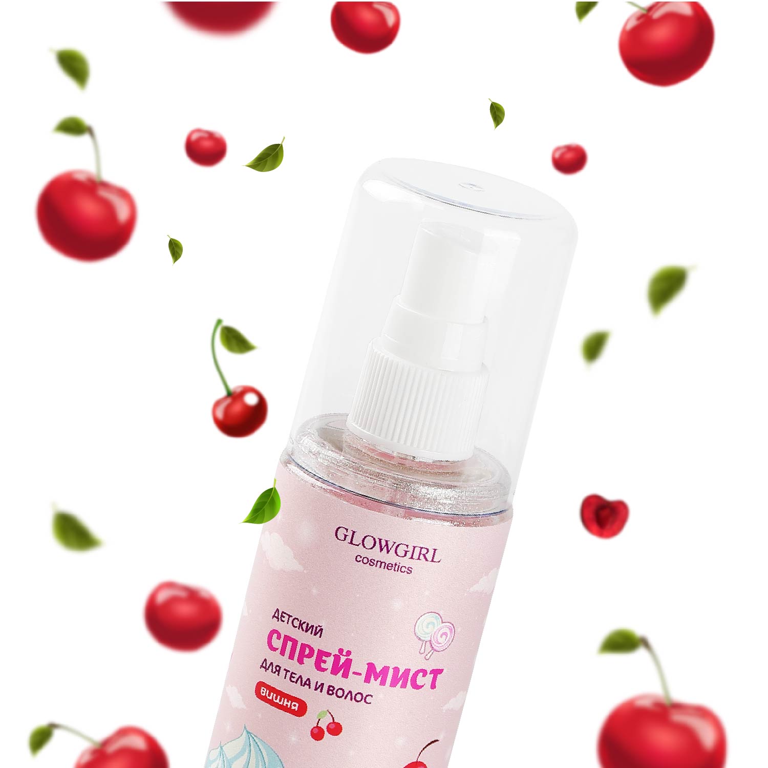 GLG1001 Glowgirl. Ароматный спрей-мист с шиммером для тела и волос детский Вишня, 125мл. ЭКО продукт.Нежное жемчужное облачко окутает Вас легким ароматом вишни, придавая деликатное магическое сияние коже и волосам.