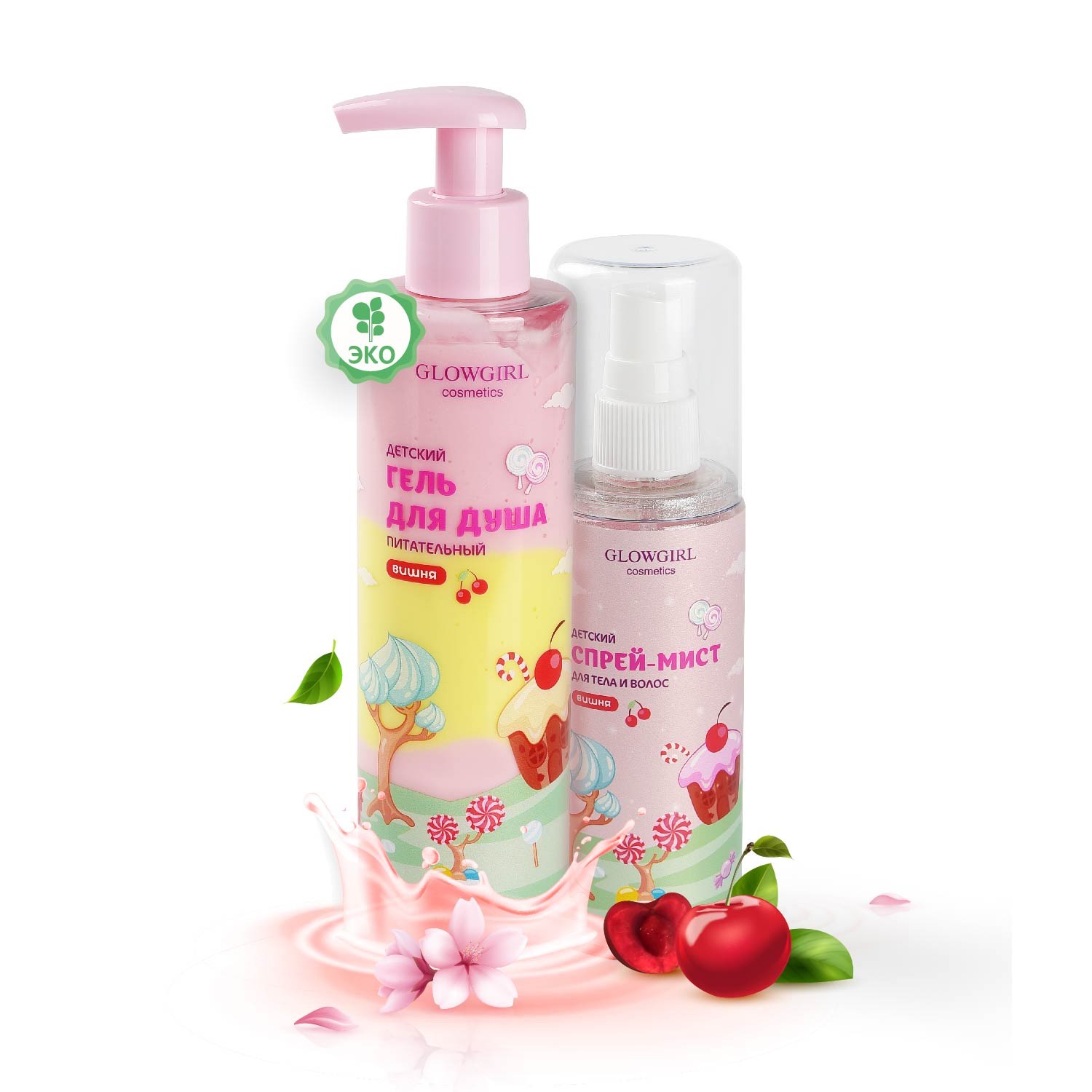 Glowgirl Подарочный набор детский спрей-мист для тела и волос ароматный с блестками + Гель для душа Вишня. ЭКО продукт.