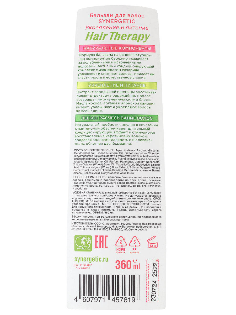 Бальзам для волос SYNERGETIC "Укрепление и питание" HAIR THERAPY - эффективное и безопасное средство для ухода за всеми типами волос. Формула бальзама на основе натуральных компонентов бережно ухаживает за ослабленными и истонченными волосами. Активный кондиционирующий комплекс с изомератом сахарида увлажняет и смягчает волосы, придает им эластичность и естественное сияние. Экстракт зародышей пшеницы восстанавливает структуру поврежденных волос, возвращая им жизненную силу и блеск. Масла кокоса, арганы и японской камелии питают, увлажняют и укрепляют волосы по всей длине. Натуральный пребиотик инулин в сочетании с пантенолом обеспечивает длительный кондиционирующий эффект и стимулирует восстановление кератиновых волокон, придавая волосам гладкость и шелковистость, облегчая расчесывание. Эффективность бальзама при регулярном использовании подтверждена аккредитованным испытательным центром.