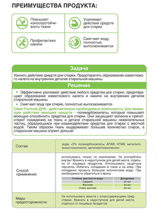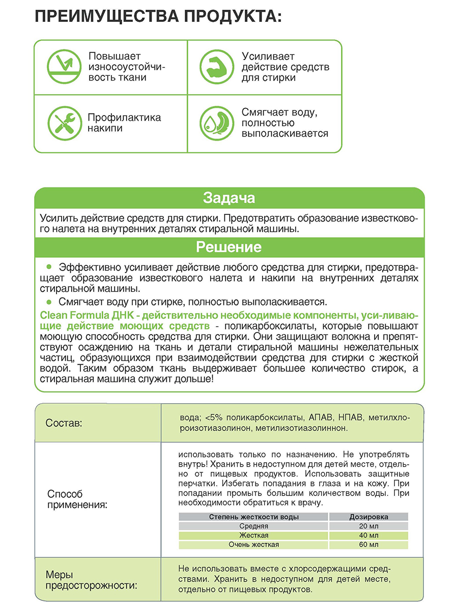 Эффективно усиливает действие любого средства для стирки, предотвращает образование известкового налета и накипи на внутренних деталях стиральной машины. Смягчает воду при стирке, полностью выполаскивается.Clean Formula ДНК Усиливающий содержит в своем составе Действительно Необходимые Компоненты. И ничего лишнего! Действующие компоненты - поликарбоксилаты повышают моющую способность средства для стирки, защищают волокна ткани и препятствуют осаждению на ткань и детали стиральной машины нежелательных частиц, образующихся при взаимодействии средства для стирки с жесткой водой. Таким образом ткань выдерживает большее количество стирок, а стиральная машина служит дольше!