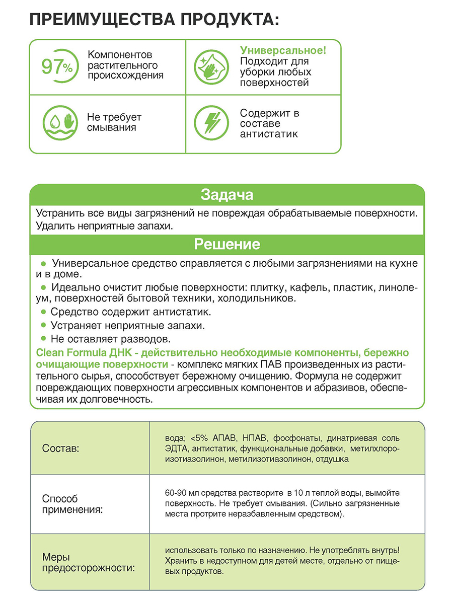 Clean Formula ДНК - действительно необходимые компоненты, бережно очищающие поверхности - комплекс мягких ПАВ произведенных из растительного сырья, способствует бережному очищению. Формула не содержит повреждающих поверхности агрессивных компонентов и абразивов, обеспечивая их долговечность.