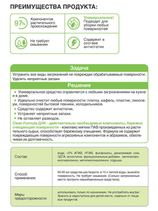 Универсальное средство справляется с любыми загрязнениями на кухне и в доме.Идеально очистит любые поверхности: плитку, кафель, пластик, линолеум, поверхностей бытовой техники, холодильников.