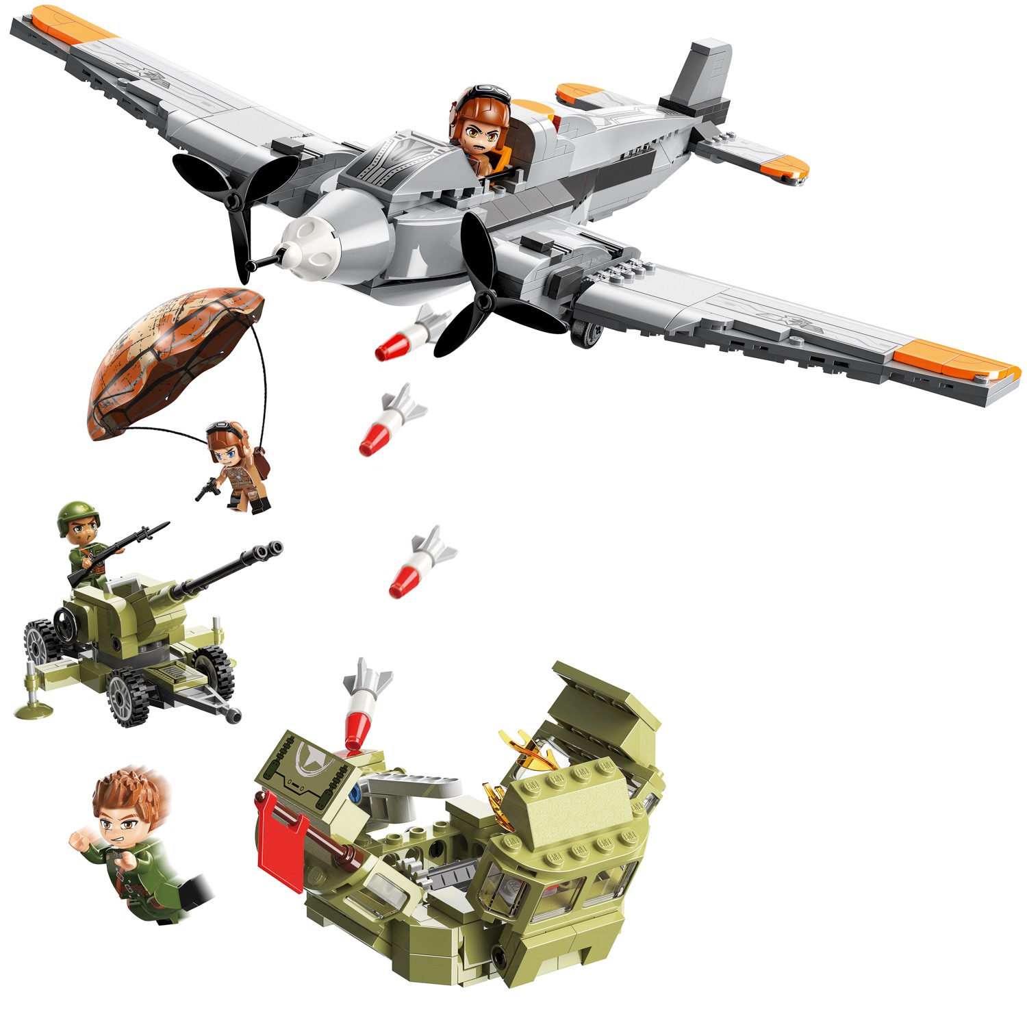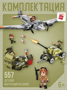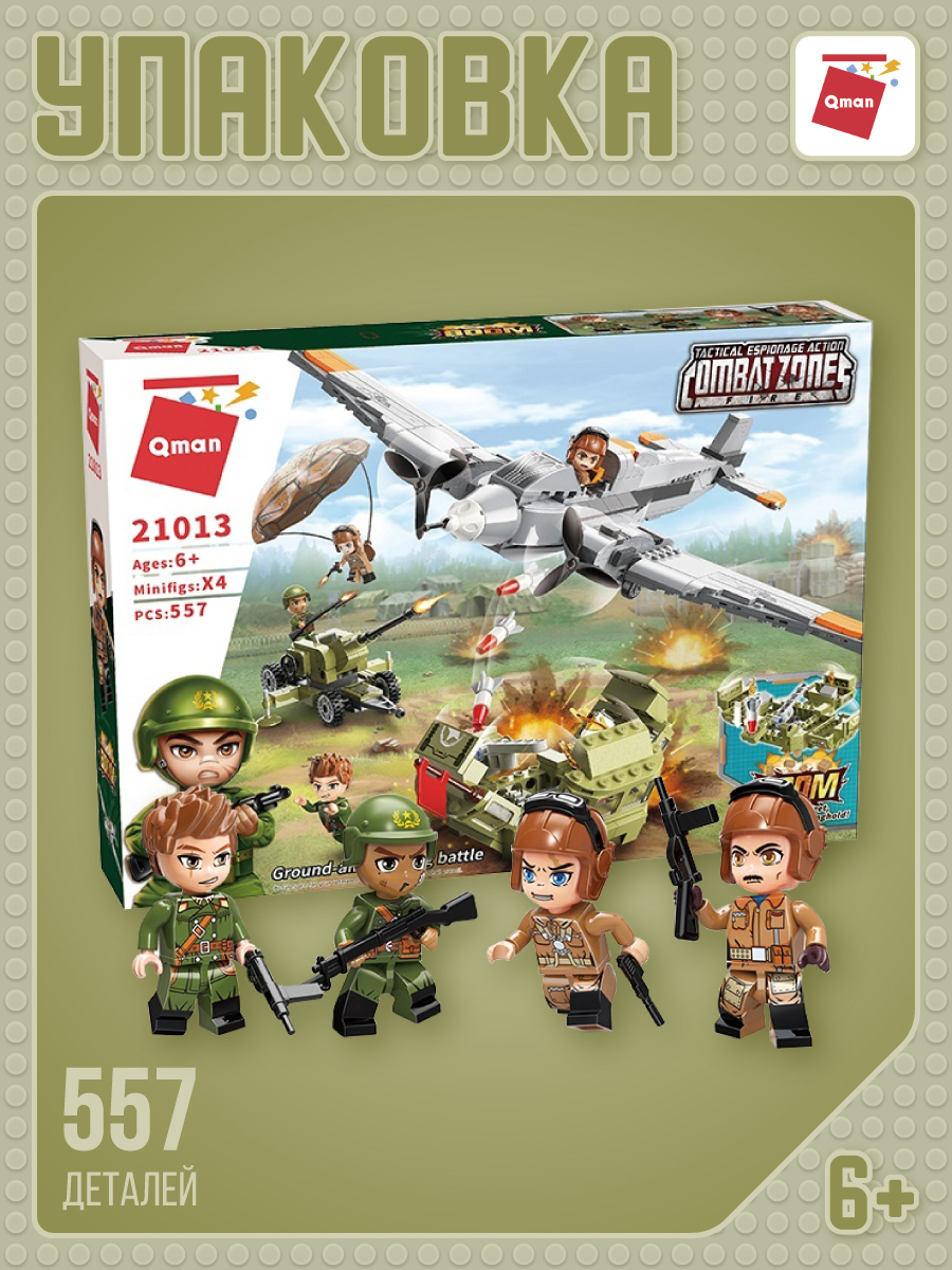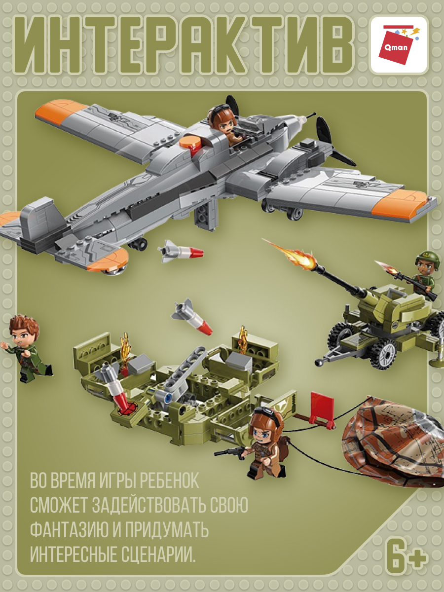 Собрав конструктор из серии «Combat Zone» от бренда QMAN, ребенок сможет разыграть сценку воздушного налета самолета противника и выброс десанта на позиции отважных воинов. Отразить атаку им поможет пушка в руках меткого стрелка. Простое и надежное соединение деталей разных размеров и форм между собой обеспечат специальные крепления. Во время игры ребенок сможет задействовать свою фантазию и придумать интересные сценарии. В процессе сборки и игры с готовой моделью юный конструктор будет развивать мелкую моторику рук, пространственное мышление, внимательность и усидчивость.В набор включены 4 фигурки.