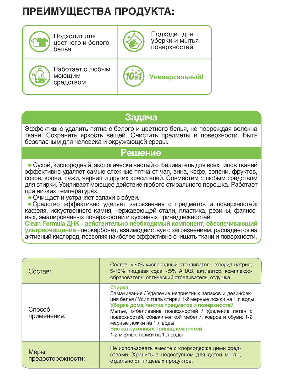 Сухой, кислородный, экологически чистый отбеливатель для всех типов тканей эффективно удаляет самые сложные и застарелые пятна от чая, вина, кофе, зелени, фруктов, соков, крови, сажи, чернил и других красителей. Совместим с любым средством для стирки, усиливает моющее действие любого стирального порошка. Можно использовать при низких температурах.Clean Formula ДНК Ультраочищающий содержит в своем составе Действительно Необходимые Компоненты. И ничего лишнего! Действующий компонент - пероксид водорода, взаимодействуя с загрязнением, распадается на активный кислород и воду, позволяя наиболее эффективно очищать ткани. Благодаря этому достигается максимальный эффект отбеливания не оказывая воздействия на цвет и волокна ткани.