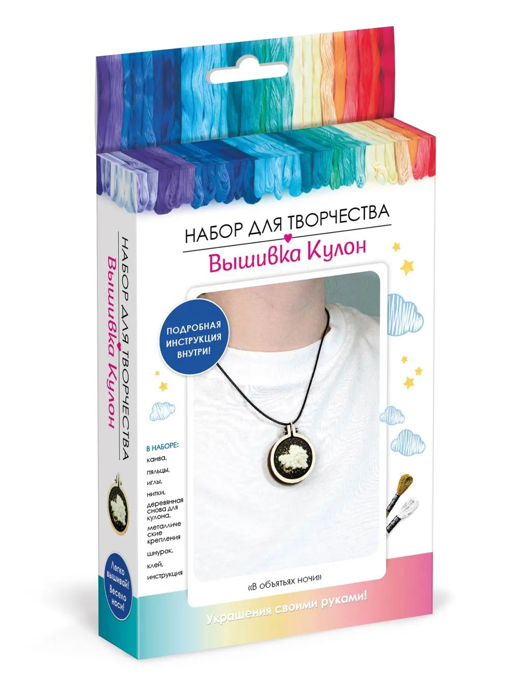 Набор для творчества вышивка кулон - отличный выбор для любителей рукоделия. Он содержит все необходимые материалы, включая пяльцы, канву с нанесенным рисунком, нитки, иглу, основу для кулона, клей и инструкцию. С помощью этого набора вы можете создать стильный и оригинальный кулон, которую можно носить самостоятельно или подарить близким.