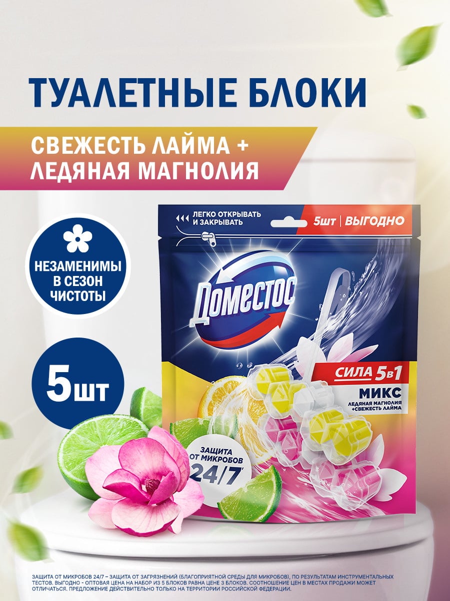 ДОМЕСТОС Сила 5в1 блок для очищения унитаза "Свежесть Лайма 2х50г +Ледяная Магнолия 3х50г