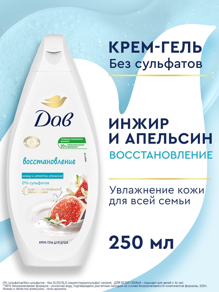 Почувствуйте атмосферу садов Средиземноморья - попробуйте крем-гель для душа Дав инжир и лепестки апельсина!Гель для душа для всей семьи разработан на основе формулы с сывороткой тройного увлажнения. Гель для душа увлажняющий восстанавливает и смягчает кожу всего за 1 применение*. Гель для душа женский бережно относится к микробиому кожи. Гель для душа мужской содержит очищающие компоненты из природного сырья, а также увлажняющий компонент растительного происхождения. Гель для душа детский имеет плотную текстуру, отлично пенится и бережно очищает кожу. Бессульфатный гель для душа Дав имеет приятный сочный аромат инжира и цветка апельсинового дерева.