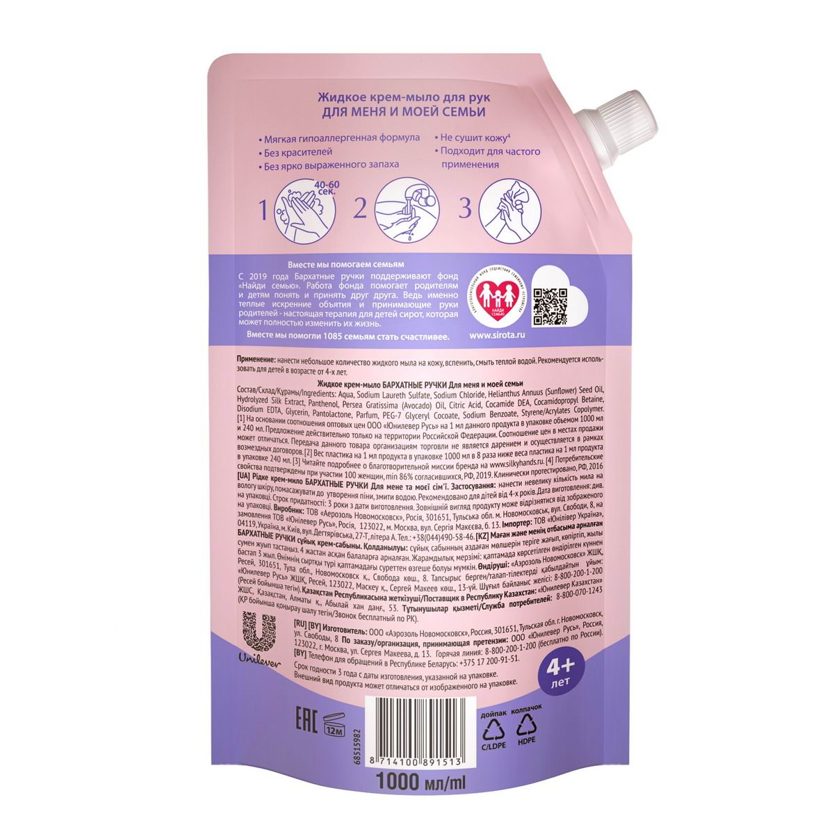 Чистые руки – твоя защита. Чаще мойте руки!Бренд Бархатные Ручки представляет крем-мыло Для меня и моей семьи. Мягкая гипоаллергенная формула жидкого крем-мыла разработана специально для ежедневного ухода за кожей ваших рук. Мыло удаляет бактерии, успешно смывая их с поверхности кожи вместе с другими ежедневными загрязнениями. Крем-мыло нежно и глубоко очищает кожу, а отсутствие выраженного запаха и красителей обеспечивает комфортное использование для каждого члена семьи. Формула Silk Oil ELIXIR обеспечивает мягкое очищение кожи. Поэтому мыло способствует уходу за кожей рук уже при мытье и подготавливает кожу к восприятию полезных компонентов крема. Уход в 2 раза эффективнее`` вместе с комплексным использованием жидкого крем-мыла Для меня и моей семьи и крема для рук Бархатные Ручки. Формула Silk Oil Elexir представляет собой комплекс, состоящий из микромасел и протеинов шелка. Благодаря своему размеру (до 10 мкм), эти частицы масел способны проникать внутрь эпидермиса, не нарушая липидный барьер, и доставлять питательные вещества клеточкам кожи. МАСЛО АВОКАДО замедляет старение кожи и предотвращает появление морщин. Питает кожу, способствует восстановлению ее защитного, иммунного барьера. Стимулирует выработку организмом коллагена и ускоряет процесс регенерации клеток кожи. ГЛИЦЕРИН оказывает смягчающее действие на кожу, увлажняет ее. Небольшие по размеру молекулы глицерина способны преодолевать липидный барьер кожи и проникать в глубокие слои эпидермиса. Исследования показали, что глицерин способствует нормальному процессу жизнедеятельности клеток эпидермиса. ПАНТЕНОЛ способствует восстановлению клеток, обладает увлажняющим и разглаживающим действием.