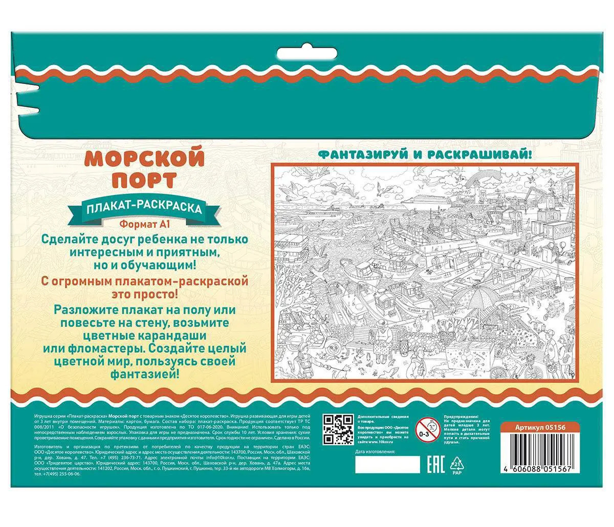 Плакат-раскраска «Морской порт» познакомит ребёнка с морским портом. Раскрашивайте корабли и яхты карандашами или фломастерами и изучайте их названия вместе с детьми.Раскраску можно постелить на пол или повесить на стену. Формат плаката – А1 (590х841 мм). Плакат-раскраска предназначен для детей от 3 лет. Рекомендуется использовать под наблюдением взрослых.