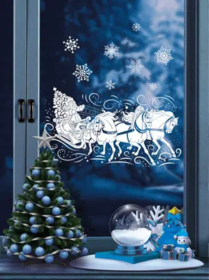 Наклейки новогодние Сфера на окна Тройка с Дедом Морозом, формат А3