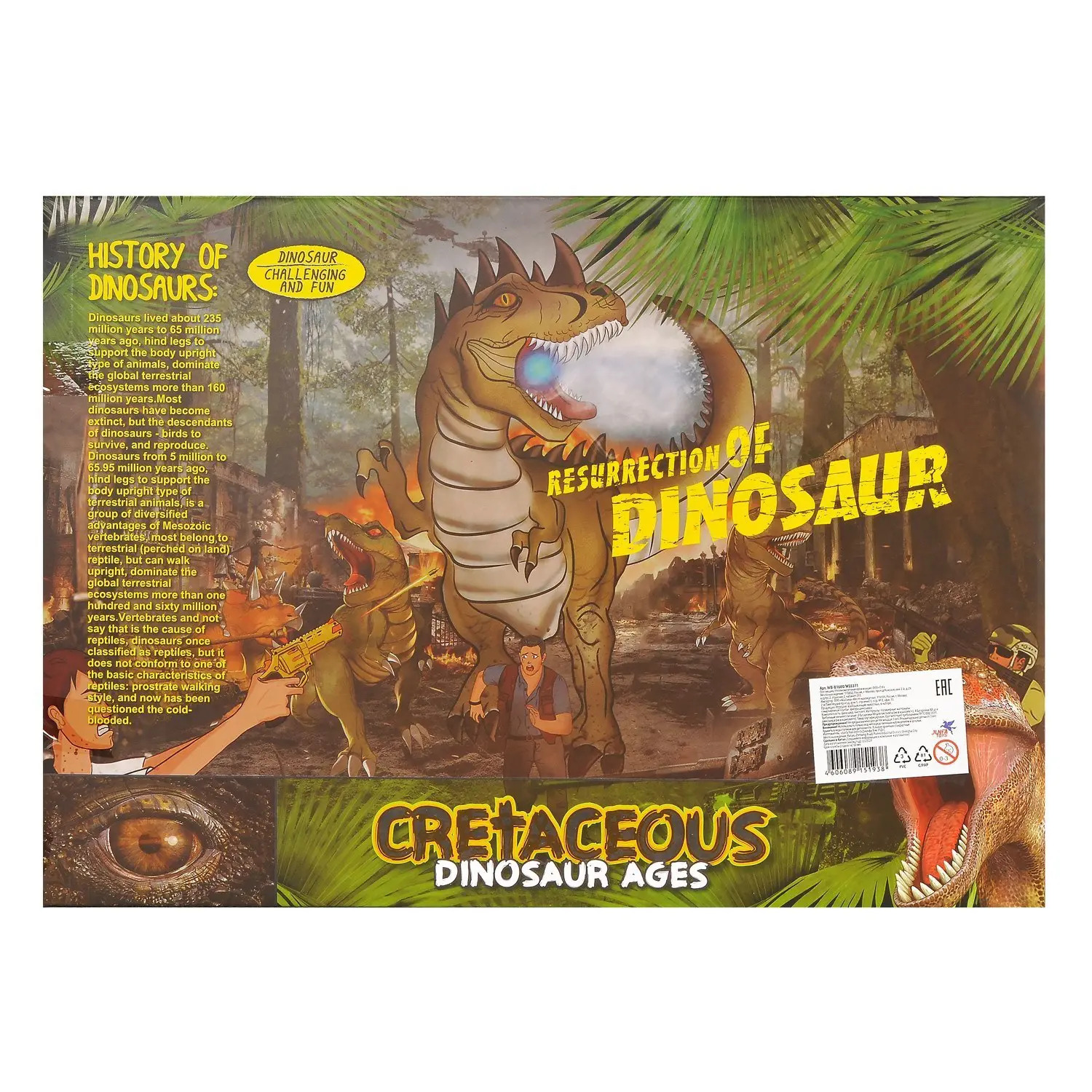 Игровой набор "Охота на динозавра" - это захватывающая игра, которая даст ребенку возможность встретиться с доисторическим животным и победить его. Динозавр имеет два игровый режима. Демонстрационный режим - при нажатии на кнопку динозавр издает звуки, из его пасти выходит пар (холодный и безопасный). Основной игровой режим - достаточно включить динозавра и его глаза зажгутся красным цветом, он начнет медленно шагать, издавая реалистичные звуки. Пистолет со звуковыми эффектами, входящий в состав набора, предназначен для охоты и победы над динозавром. Стреляйте из него и при каждом попадании динозавр будет выпускать пар, поочередно терять свои передние лапы и в конце концов упадет поверженный.Резервуар для наполнения водой спрятан под шипом в верхней части головы динозавры. Откиньте его и налейте воду в открывшееся отверстие.