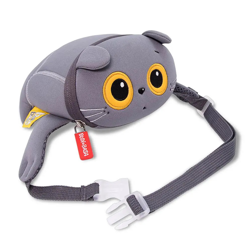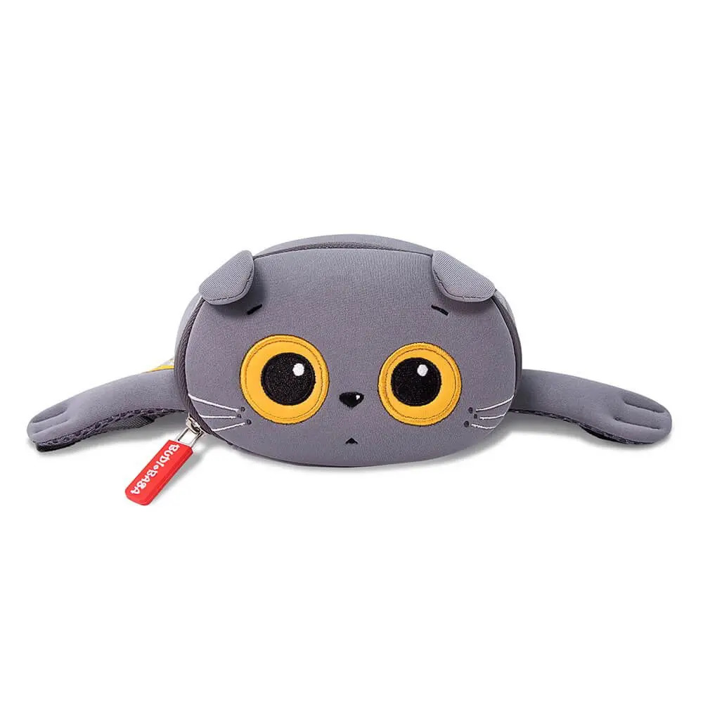 Милая поясная сумочка в виде котёнка Басика с большими круглыми глазами, загнутыми вперед ушками, хвостиком-пищалкой и обнимательными лапками.Компактная, легкая, красивого серебристо-пепельного цвета.