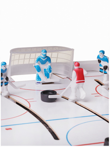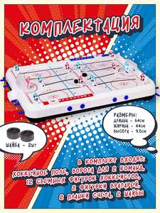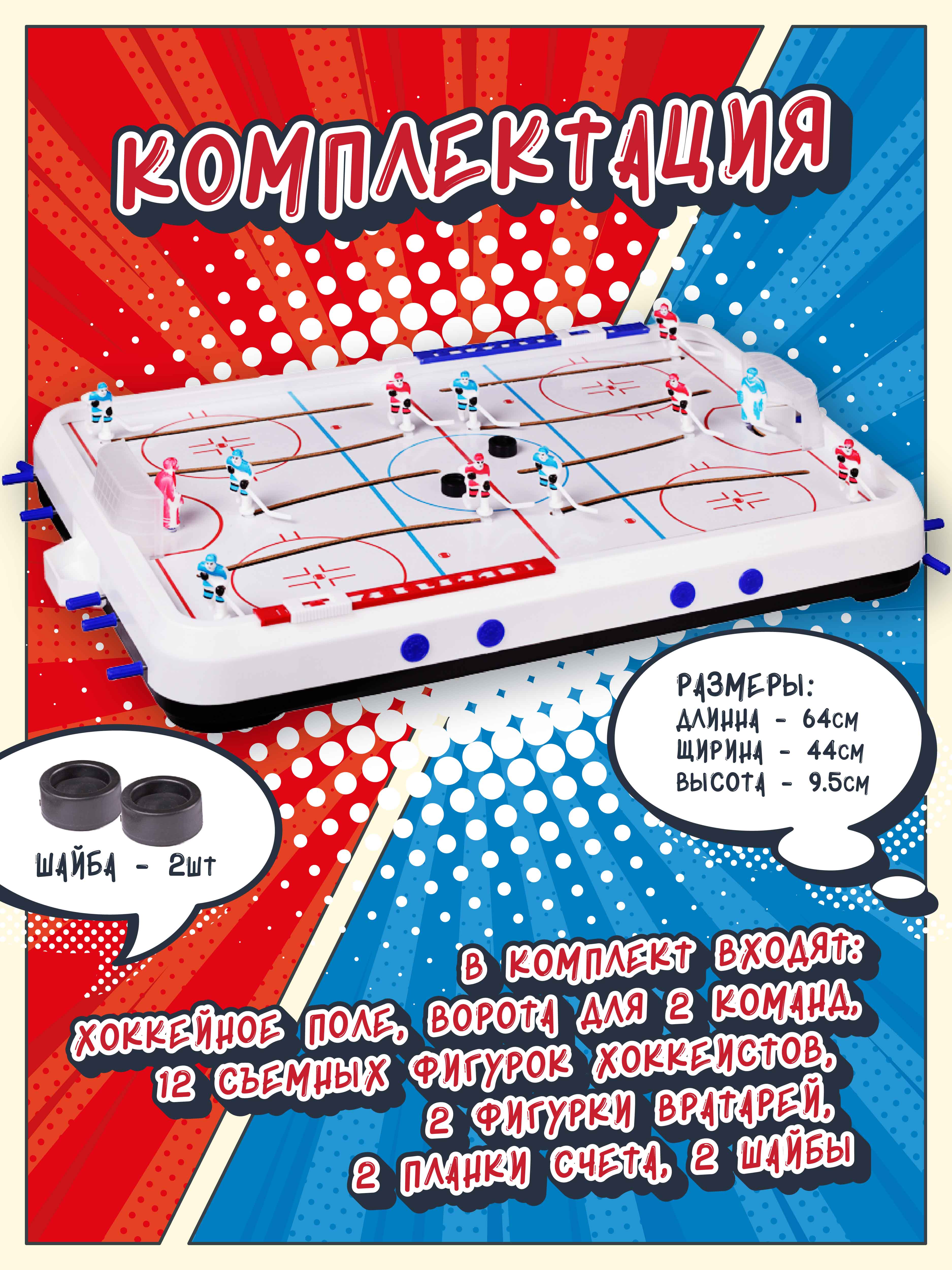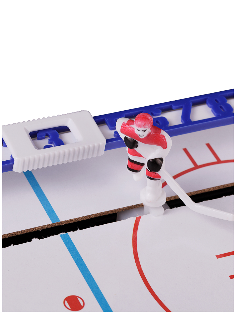 Настольный хоккей - это увлекательная игра для детей и взрослых, которая позволит отлично провести время с семьей или в кругу друзей. В процессе игры можно передвигать фигурки хоккеистов в продольном направлении и вращать вокруг своей оси при помощи надежного механизма поворота игроков. ДОПОЛНИТЕЛЬНЫЕ ПРЕИМУЩЕСТВА: в комплекте есть запасная шайба и 2 запасные фигурки хоккеистов. Сборка игры займет не больше 10 минут. Эффективная система поворота игроков позволяет быстро ответить на бросок противника. Большое игровое поле размером 64 на 44 см делает игру интереснее. В комплект входят: хоккейное поле, ворота для 2 команд, 12 съемных фигурок хоккеистов, 2 фигурки вратарей, 2 планки счета, 2 шайбы. Размер шайбы: диаметр 25 мм., толщина 10 мм. Размеры упаковки: 74х47х10 см.