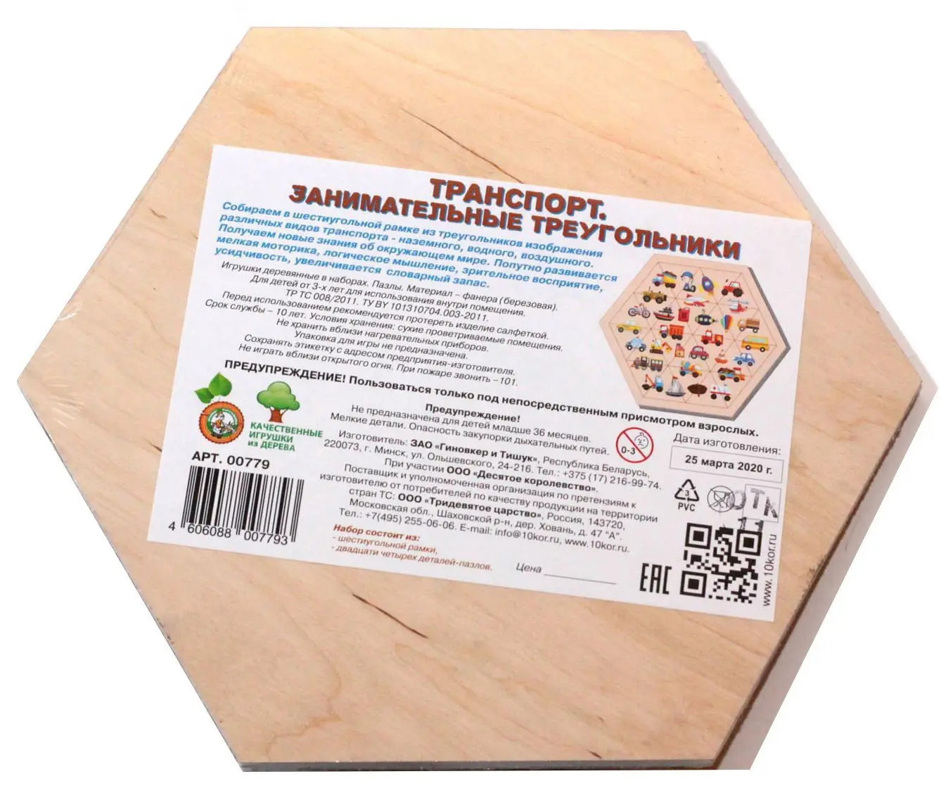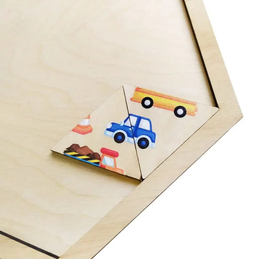 Деревянный пазл в форме шестигранника с треугольными фишками. Состав: игровое поле в форме шестигранника (размер по горизонтали – 22,5 см, размер по вертикали между параллельными сторонами – 19,5 см), треугольные фишки – 24 шт. (размер – 5 х 5 х 5 см). Основа пазла имеет углубление, в котором ребёнку необходимо расставить треугольные фишки так, чтобы все картинки совпали. На каждой фишке – не целая картинка, а только фрагменты 30 рисунков, которые удастся увидеть в том случае, если ребёнок сможет верно сложить все фишки. Картинки посвящены транспортной тематике. Игра расширяет кругозор, а также тренирует логику и мелкую моторику рук.