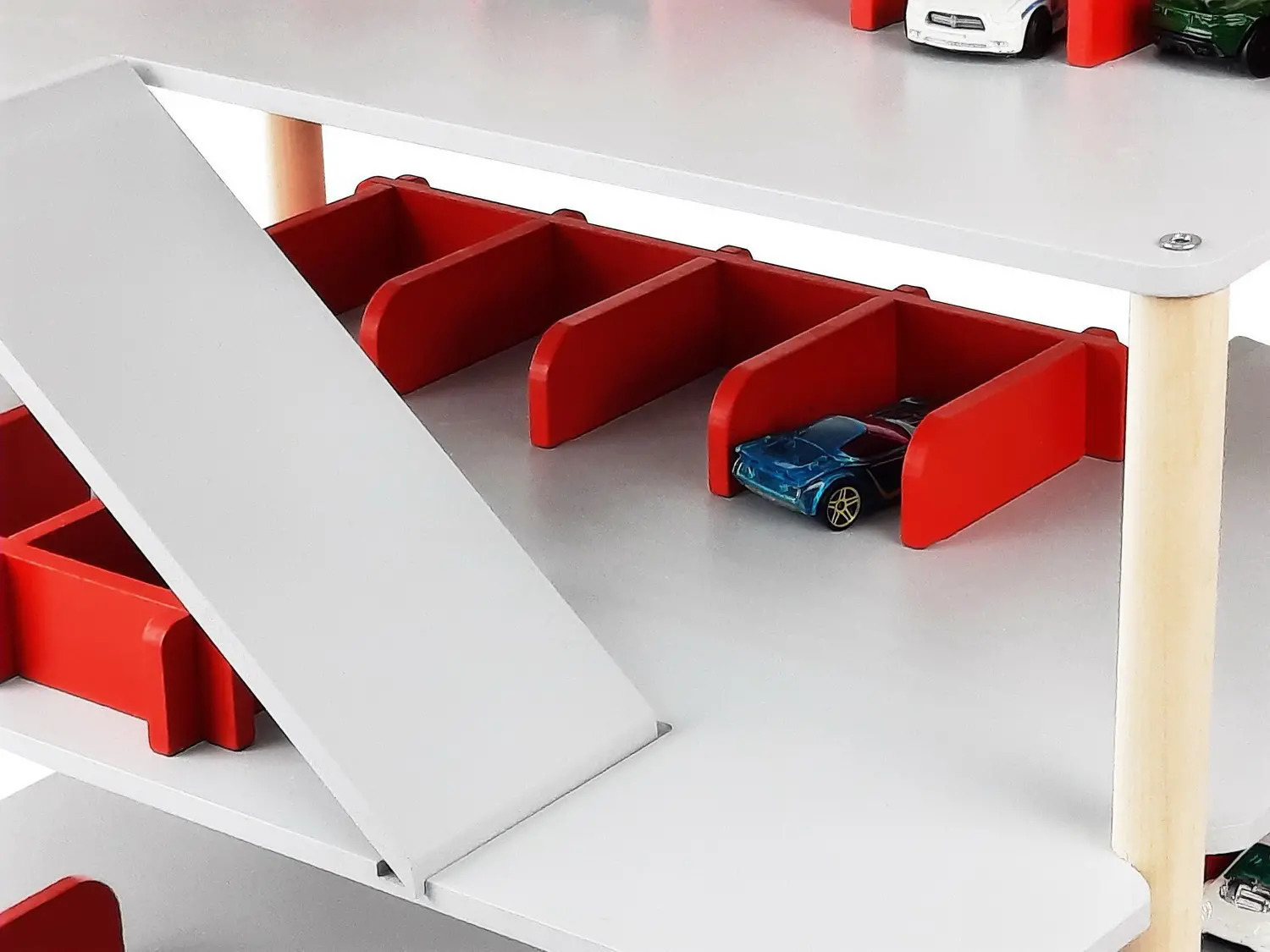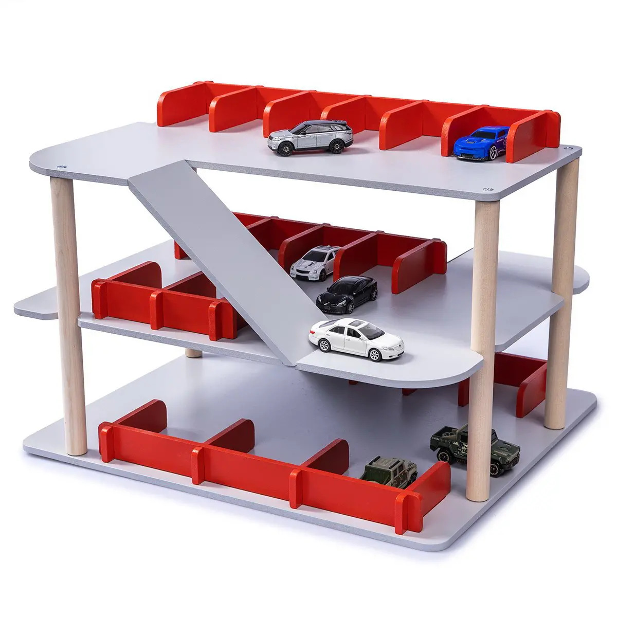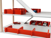 Многоэтажный гараж для машинок. Состав: детали гаража – 37 шт., конфирмат 5 х 40 – 8 шт., схема сборки. Размер гаража в собранном виде: 36 х 40 х 29 см. Материалы: дерево, древесные материалы, металл.