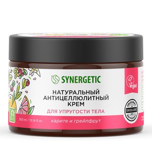 Натуральный антицеллюлитный крем SYNERGETIC для упругости тела питает, увлажняет, тонизирует, подтягивает кожу и дарит долговременное ощущение комфорта и мягкости. Активные компоненты крема в сочетании с изомератом сахарида обеспечивают сохранение влаги в коже, обладают регенерирующим действием и восстанавливают барьерные функции кожи. Масла карите, какао и кокоса способствуют улучшению тонуса и разглаживанию микрорельефа, а экстракты кофе и грейпфрута оказывают мощное антиоксидантное, регенерирующее и омолаживающее действие. Натуральный пребиотик трегалоза в сочетании с остальными компонентами помогает нормализовать и сохранить естественный микробиом кожи. Парфюмерная композиция с нотами грейпфрута и карите оставляет на коже нежный и приятный аромат на долгое время. Безопасная формула с высокой концентрацией натуральных компонентов не содержит парабенов, минеральных масел, силиконов, красителей и компонентов животного происхождения. Крем не тестируется на животных и сертифицирован британской организацией The Vegan Society. Знак Vegan - мировой стандарт этичной продукции. Дерматологически протестирован независимым институтом Dermatest® в Германии.