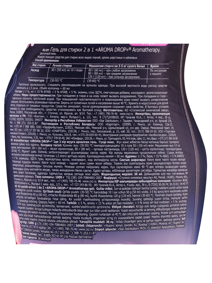 Гель и кондиционер 2 в 1 Aroma Drop Aromatherapy 1000 мл идеально подходит для эффективной и бережной стирки. Благодаря инновационной формуле и жидкой текстуре, этот чудо средство обладает не только очищающими свойствами, но и выполняет функцию смягчения, ароматизации и защиты всех видов тканей, обеспечивает полностью безупречный результат, не оставляя следов или разводов на вашей одежде. Ополаскиватель является универсальным решением, как для ручной стирки, так и для автоматических стиральных машин (автомат) в воде любой жесткости. Этот уникальный продукт обладает высокой эффективностью и легко справляется с отстирыванием белья (кроме шерсти и шелка), будь то цветная или белая одежда. С помощью нашего универсального средства вы можете забыть о порошке, так как гель для стирки и кондиционер намного экономичнее, заменяет 2 кг порошка + 1 л кондиционера. Формула разработана таким образом, чтобы сохранять яркость и насыщенность цвета вашей одежды, 100% выполаскивается из волокон ткани. Жидкий порошок содержит специальные компоненты, которые защищают ткани от загрязнений и сохраняют их красоту и свежесть. Обеспечивает мягкое и бережное отношение к волокнам, сохраняя структуру и форму и предотвращая их износ и появления катышек, благодаря комплексу энзимов. Эффективно удаляет пятна и загрязнения при любой температуре, обеспечивая безупречную чистоту и яркость вашей одежды. Средство подарит вещам изысканный легкий и расслабляющий аромат свежести и цветов. Попробуйте бытовую химию Арома Дроп, и вы будете поражены его эффективностью, безупречными результатами и длительным сохранением свежести вашего белья.