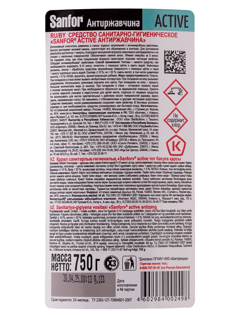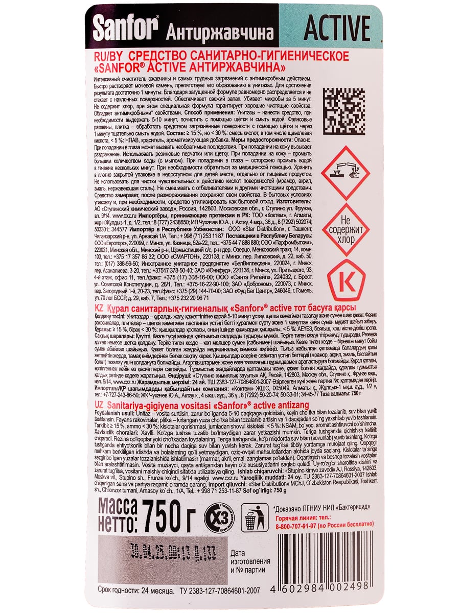 Sanfor: Active «Антиржавчина» — мощное средство, которое позволяет справиться с самыми трудными загрязнениями и ржавчиной всего за минуту. Sanfor равномерно распределяется и не стекает с наклонных поверхностей. Средство быстро растворяет водный и мочевой камень и препятствует его образованию в унитазах. После использования остаётся лёгкий и свежий аромат.