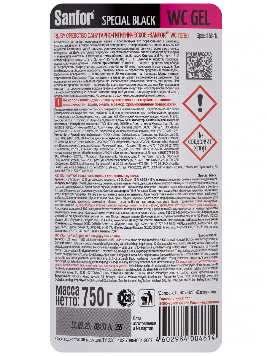 Средство для сантехники WС black 1 л. Назначение. Безупречно устраняет известковый налет и препятствует его образованию в унитазах, удаляет ржавчину, а также легко очищает поверхность от жировых пятен, плесени, мыльных потеков. Благодаря густой формуле равномерно распределяется и не стекает с наклонных поверхностей. Действует даже под водой! Обеспечивает свежий запах. Подходит для уборки и дезинфекции туалетов для животных. Обладает антимикробными свойствами. Способ применения. Нанести средство под ободок и распределить внутри унитаза, выдержать не более 10 минут, почистить и смыть водой. При необходимости обработку повторить. Фаянсовые раковины обработать средством и смыть водой. Полы (плитка, линолеум), сантехническая арматура, пластмасса мыть раствором 2-3 колпачка средства на 1 л воды. Меры предосторожности. Осторожно! Содержит щавелевую кислоту! При попадании в глаза и на кожу вызывает раздражение. Рекомендуется использовать щетку или резиновые перчатки. При попадании на кожу - промыть большим количеством воды. При попадании в глаза - осторожно промыть водой в течении нескольких минут. При необходимости обратиться за медицинской помощью. Хранить в плотно закрытой упаковке в недоступном для детей месте, отдельно от пищевых продуктов. Не применять для чистки чувствительных к действию кислот поверхностей (мрамор, акрил, эмаль). Не смешивать с другими веществами. Состав. ? 5%, но < 15%: АПАВ, кислота щавелевая, < 5%: лимонная кислота, краситель, ароматизирующая добавка. Условия хранения. Хранить в недоступном для детей месте. Не смешивать с другими веществами. Хранит плотно закрытым в прохладном месте, отдельно от пищевых продуктов. Средство замерзает, после размораживания сохраняет свои свойства. По истечении срока годности средство и упаковку утилизируют как бытовой отход. Срок годности. 36 месяцев.
