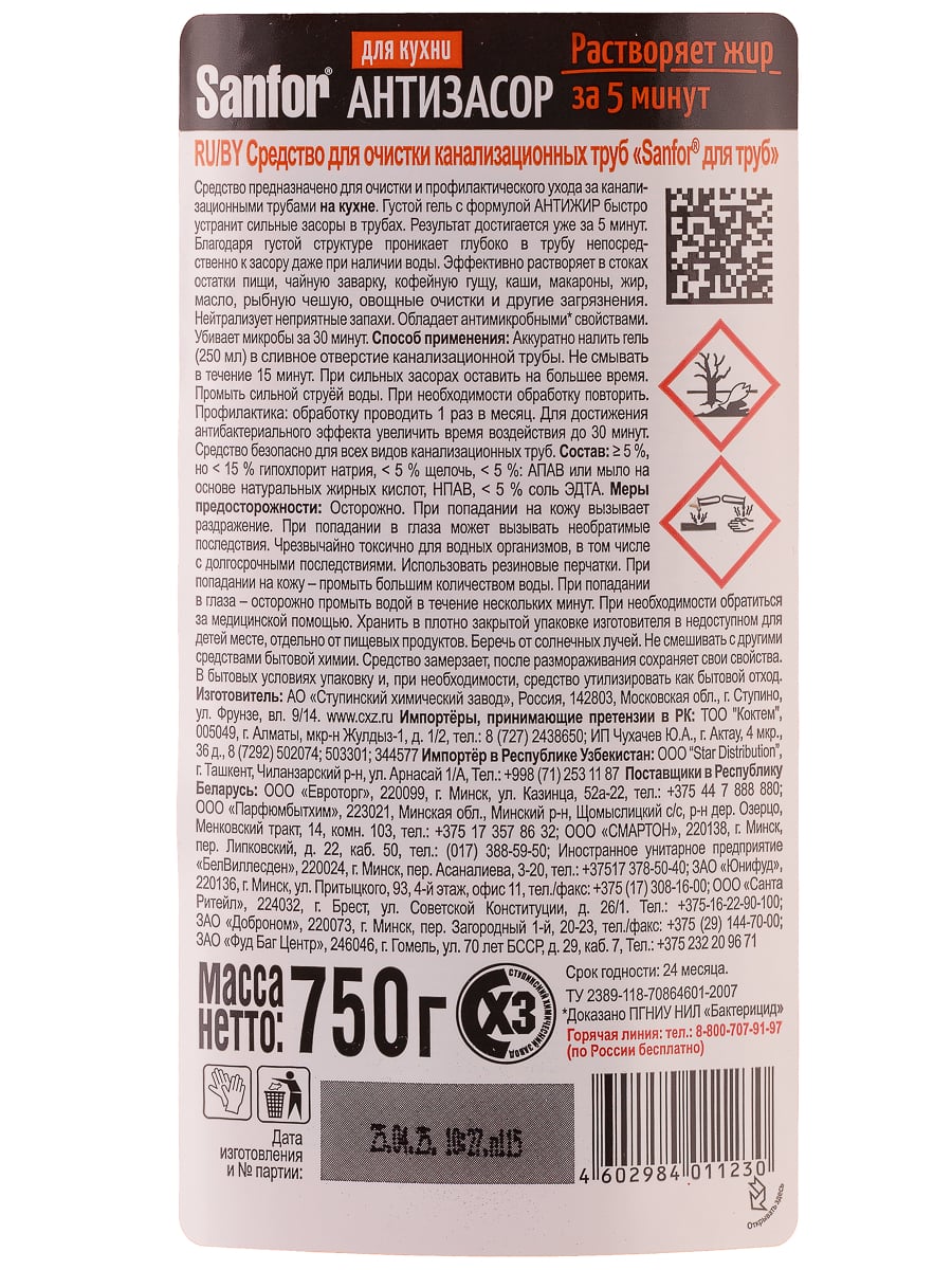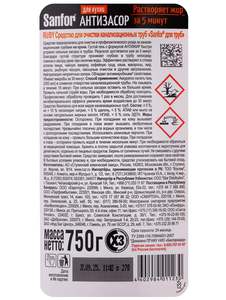 Средство Sanfor для очистки труб (прочистка труб на кухне) 750г