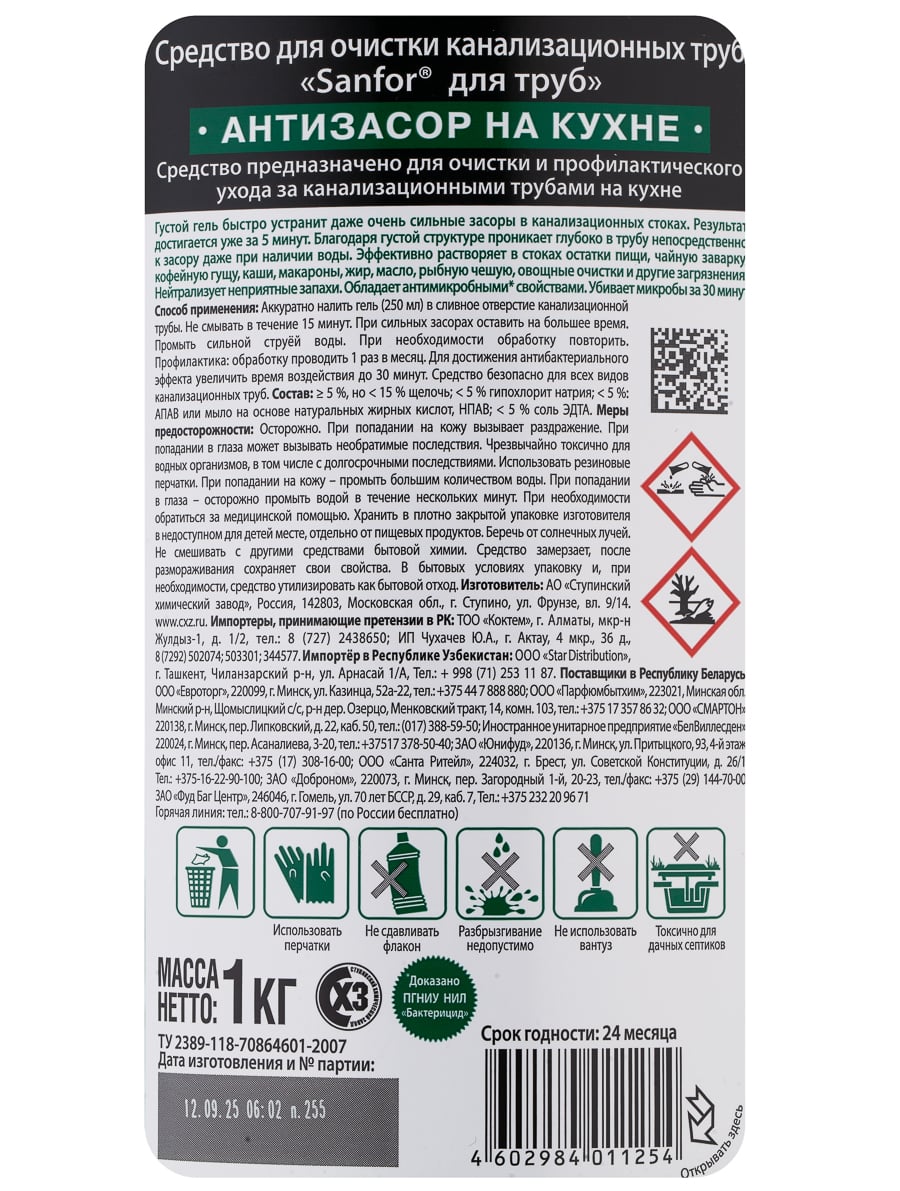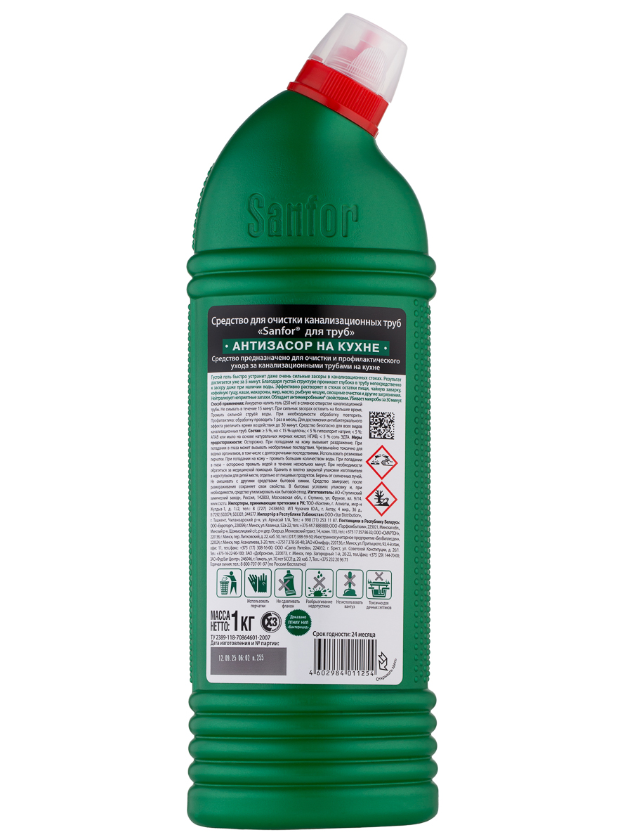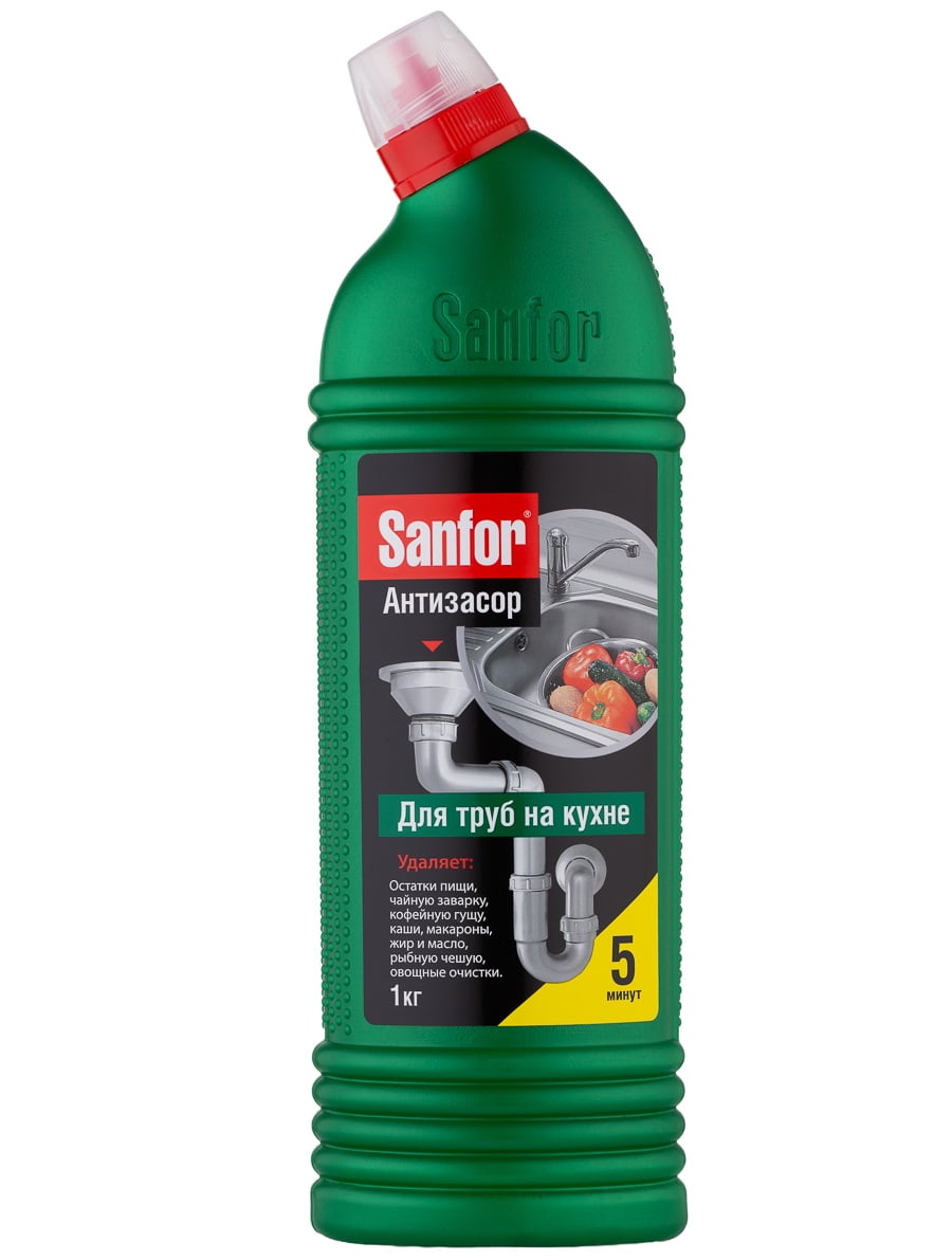 Мощное средство для читки всех типов засоров от бренда SANFOR подходит для дома, кухни, ванной и туалета.Очистка канализационных труб происходит в течение 1-5 минут, достаточно залить очиститель в раковину, ванну или унитаз для удаления засора, после смыть водой. Приятным бонусом будет дезинфекция всех поверхностей.Подходит для любой пластиковой сантехники. Гель для устранения засоров отлично справляется с вычищением волос, жира, шерсти кошек и других животных, а также подходит для борьбы и устранением неприятного запаха в канализации.Чистящее средство санфор легко выполнит чистку труб. Антизасор безопасен для пластика и легко прочистит сифон, литровая канистра порадует Вас удобным применением, а самое главное, великолепным эффектом!