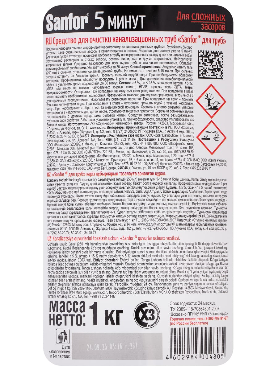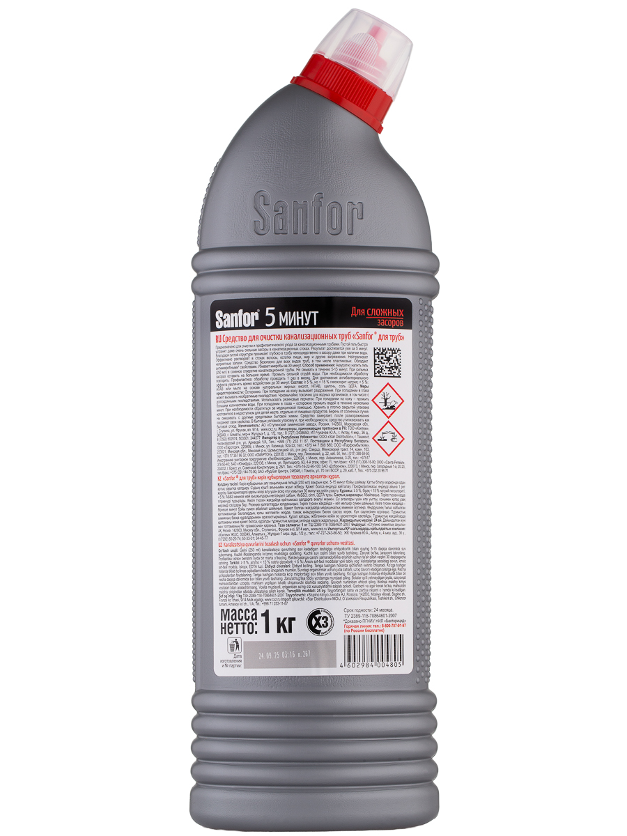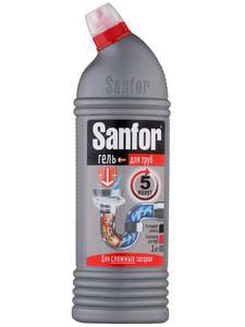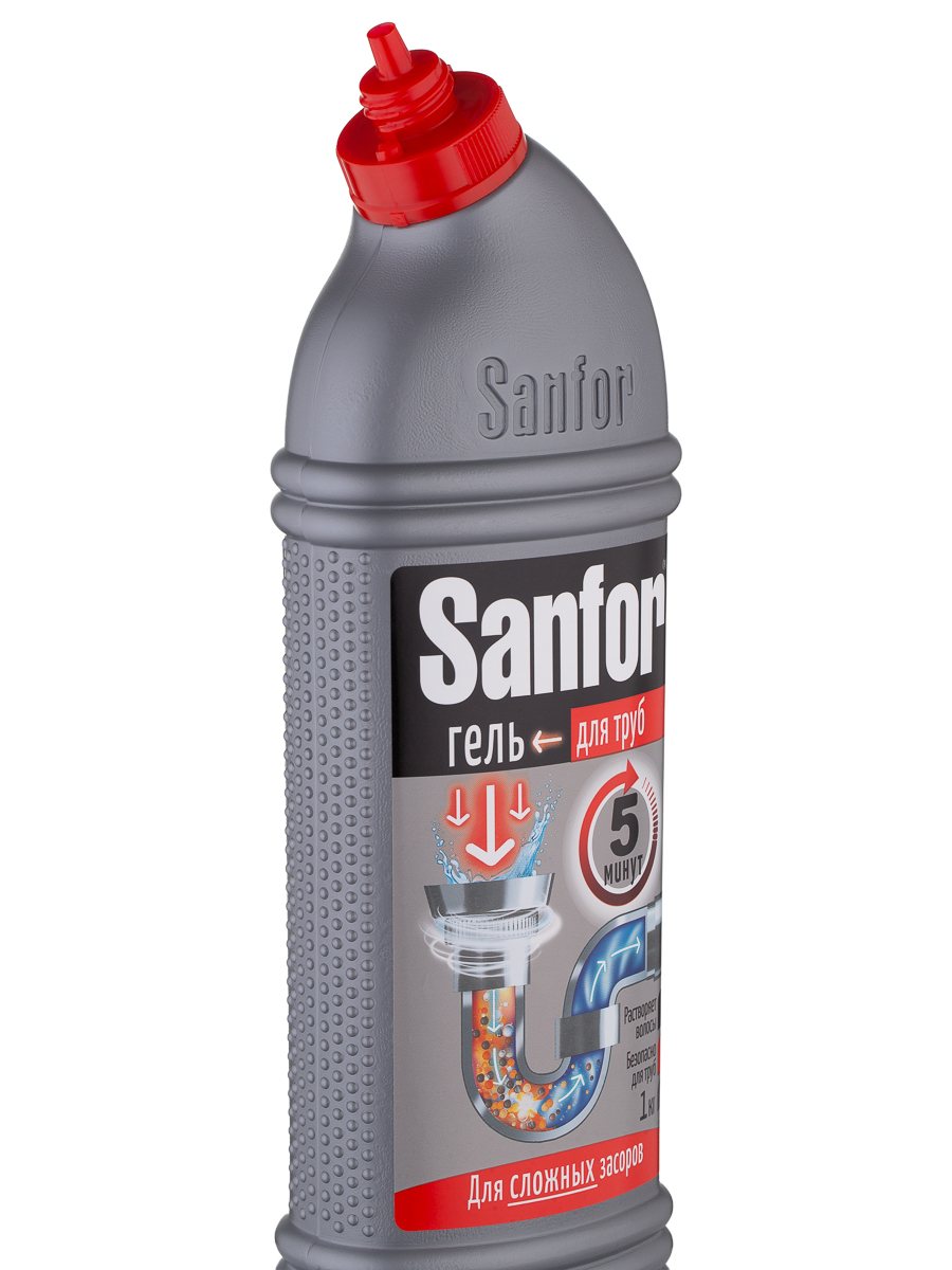 Средство для очистки канализационных труб "Sanfor" быстро устранит даже очень сильные засоры в канализационных стоках. Результат достигается уже за 5 минут. Благодаря густой структуре проникает глубоко в трубу непосредственно к засору, даже при наличии воды. Эффективно растворяет в стоках волосы, остатки пищи, жир и другие загрязнения. Нейтрализует неприятные запахи. Средство безопасно для всех видов труб, в том числе и пластиковых. Убивает микробы за 30 минут.