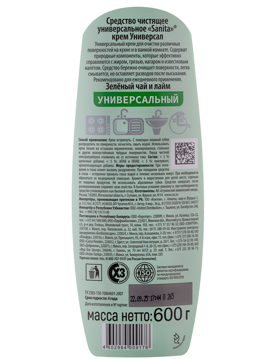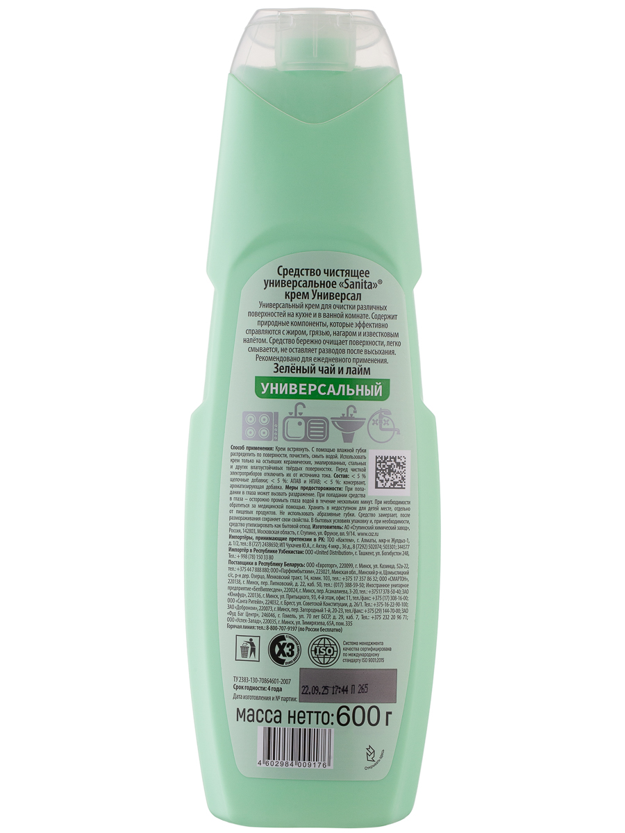 SANITA Крем чистящий Универсальный для ванной и кухни Зеленый чай и лайм 600 г