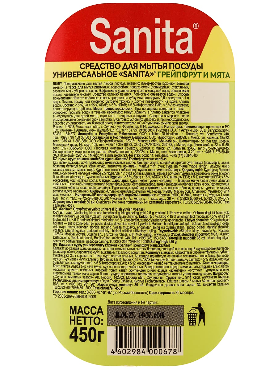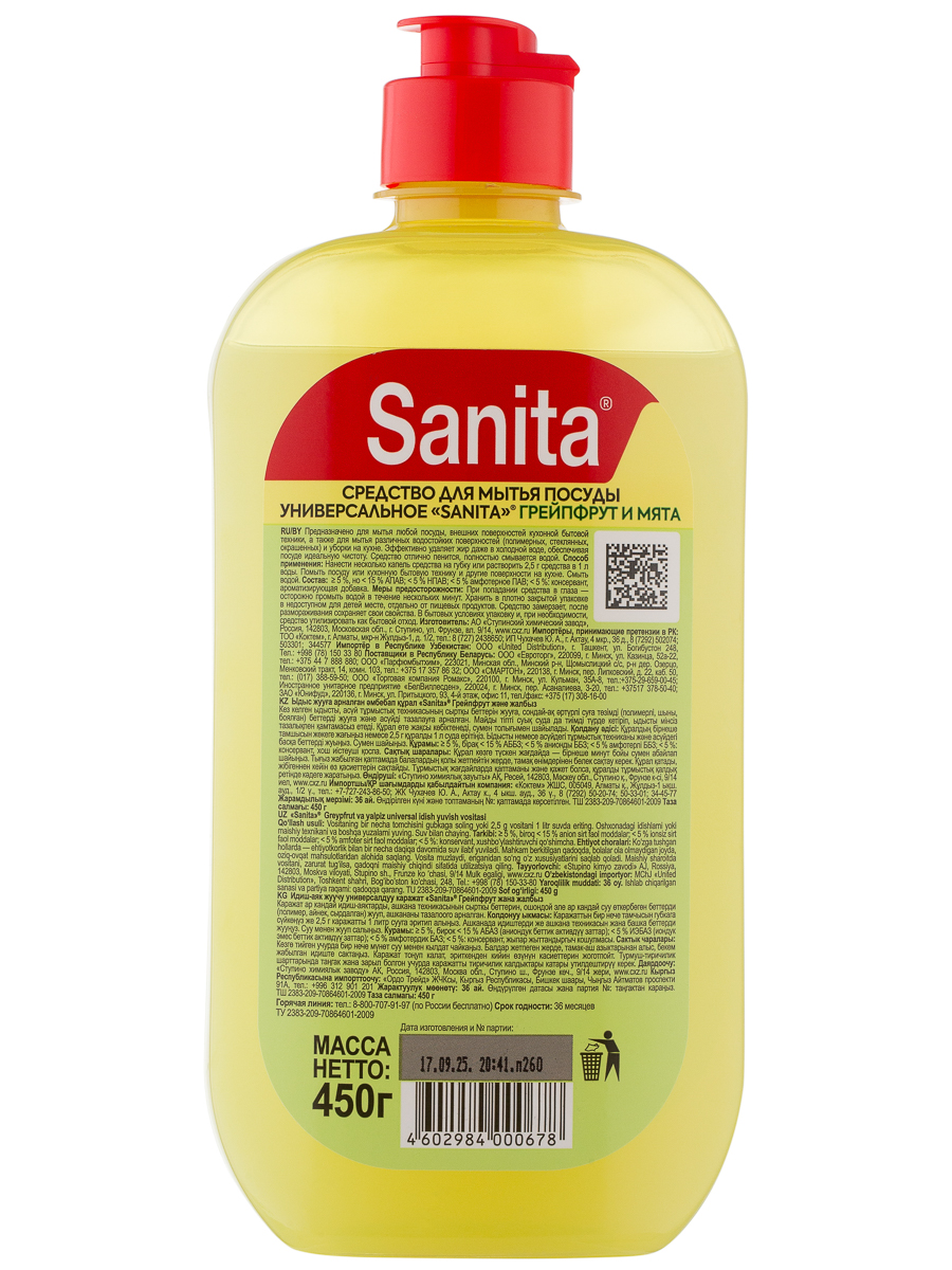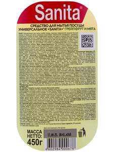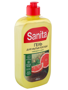 SANITA Гель для мытья посуды от засохшей пищи и жира Грейпфрут + мята 450 г