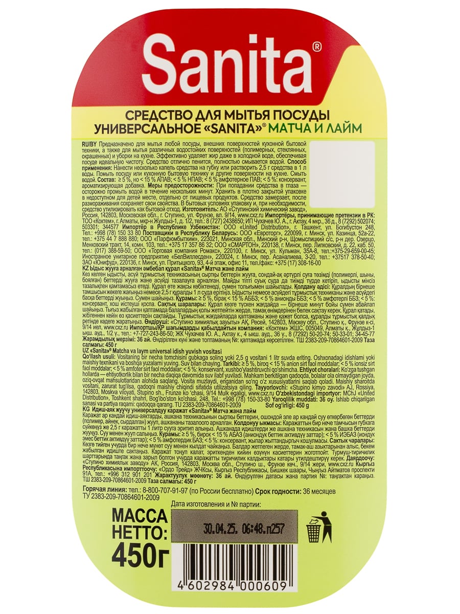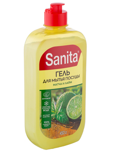 SANITA Гель для мытья посуды от засохшей пищи и жира Матча + лайм 450 г