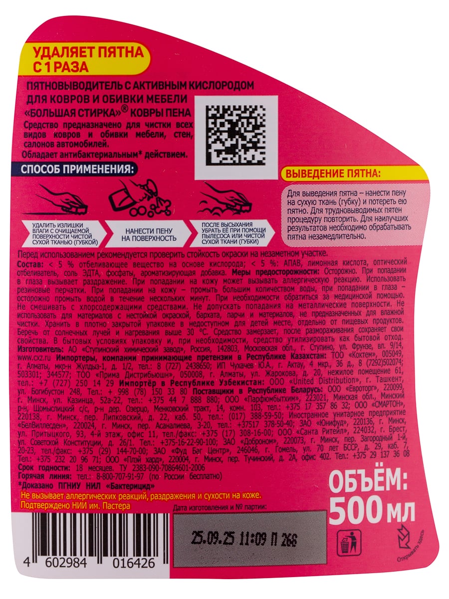Спрей-пятновыводитель для ковров "Большая стирка" - это многофункциональное и универсальное чистящее средство, предназначенное для эффективной уборки дома. Этот очиститель, разработанный профессионалами в области бытовой химии, обеспечивает глубокое и мягкое очищение ковровых покрытий и обивки мягкой мебели (диваны, кресла и тд).Специально созданная концентрированная формула этого средства позволяет эффективно удалять различные загрязнения и пятна (вино, сок, кровь, жир и тд), включая пыль, грязь, шерсть домашних животных и другие несовершенства. Оно без проблем справляется с пятнами на ткани и ковролинах, придавая им новую жизнь и освежая их цвет.Спрей "Большая стирка" имеет мощный отбеливающий эффект и пятновыводитель, что позволяет без труда устранять даже самые сложные и стойкие пятна, въевшиеся в волокна. Благодаря своей уникальной формуле, средство глубоко проникает в ткань, эффективно очищает и освежает, при этом оставляя приятный аромат и устраняя неприятные запахи.Концентрат "Большая стирка" обладает высокой концентрацией активных компонентов, поэтому даже небольшое количество средства обеспечивает отличные результаты. Просто нанесите небольшое количество на поверхность, а затем при необходимости потрите щеткой и промойте водой. Ваш ковер или мягкая мебель вновь станут свежими, чистыми и безупречными.Будьте уверены в эффективности и надежности средства для чистки ковров "Большая стирка". Раскройте его многофункциональный потенциал и наслаждайтесь идеальной чистотой и свежестью в своем доме.