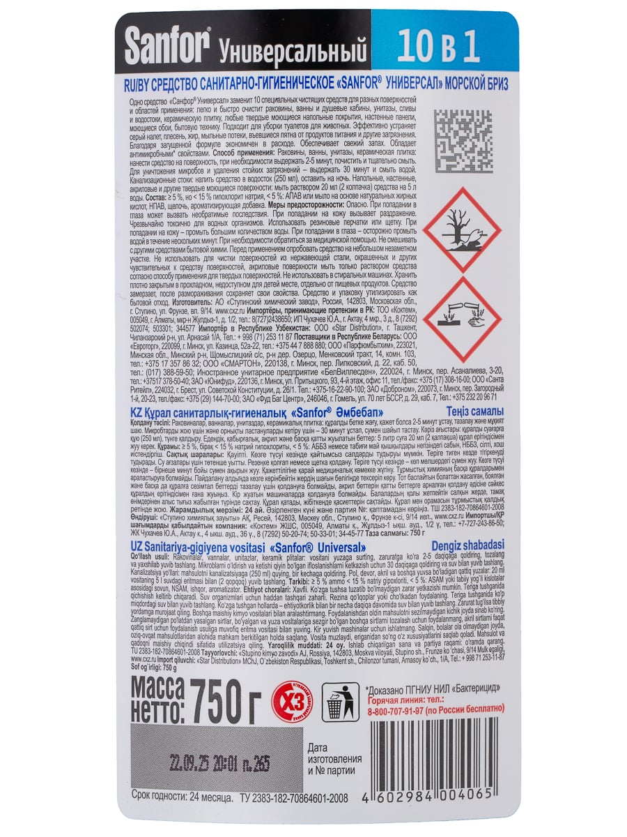 Sanfor Универсальный для уборки дома 10в1 "Морской бриз" с хлором 750 г