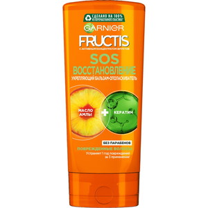 Fructis представляет систему восстановления волос, которая совмещает в себе суперфрукт натурального происхождения с активными ингредиентами. Бальзам-Ополаскиватель SOS Восстановление обогащен двумя суперингредиентами: Формула с маслом амлы и кератином питает и укрепляет поверхность волос по всей длине, а также восстанавливает повреждения волос, вызванные внешними воздействиями (сушка феном, тепловая укладка). Доказано! Устраняет 1 год повреждений за 3 применения. Волосы выглядят более здоровыми, шелковистыми и блестящими.