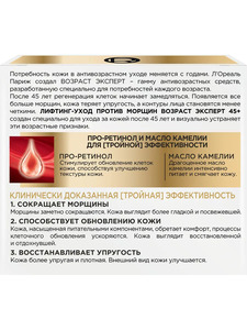 Лифтинг-уход против морщин Возраст Эксперт 45+ создан специально для ухода за кожей после 45 лет и визуально устраняет возрастные признаки.Про-ретинол стимулирует обновление клеток кожи, способствуя улучшению текстуры кожи.